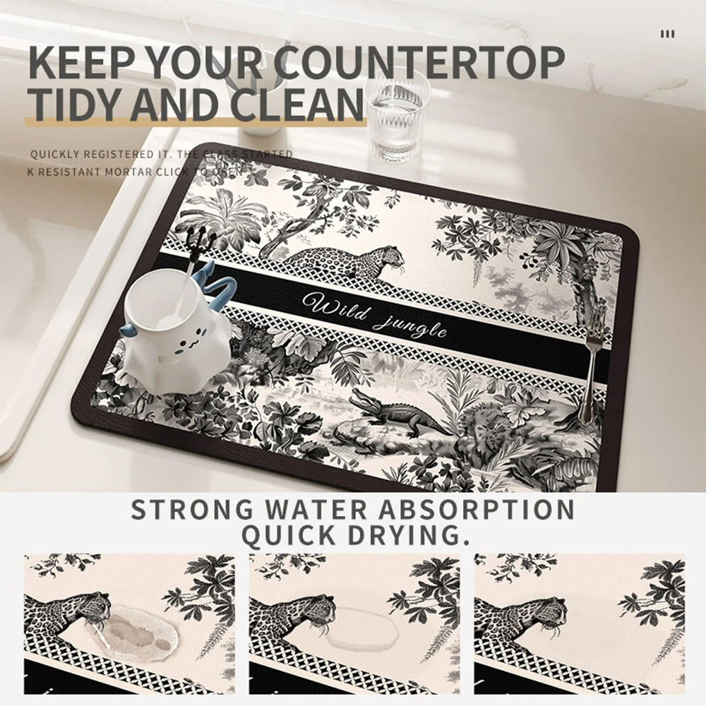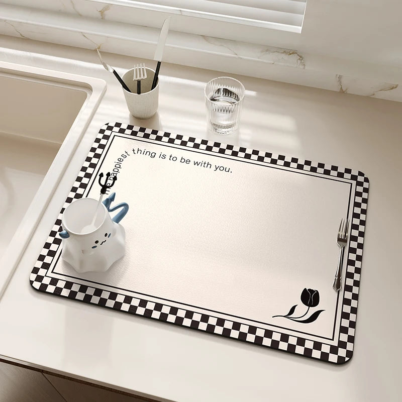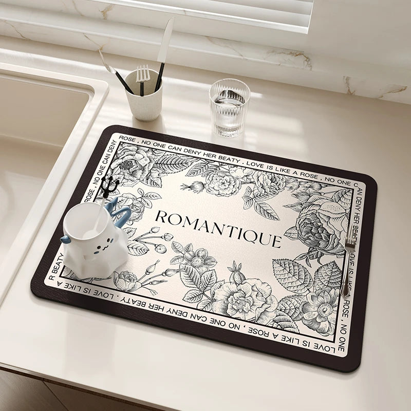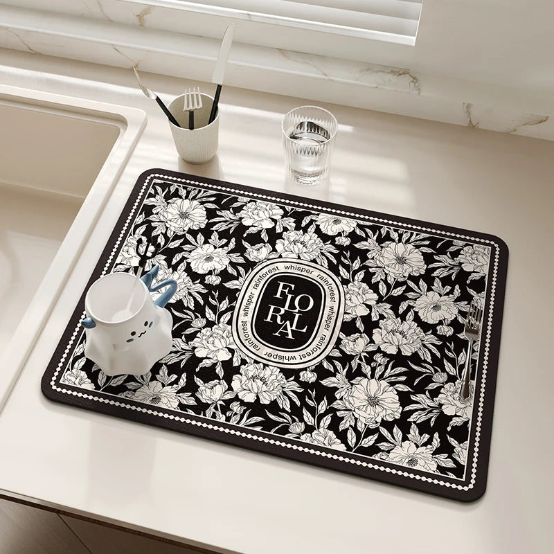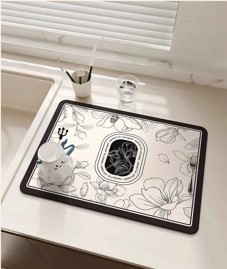 Fügen Sie Ihrer Küche Stil und Effizienz mit unserer Abtropfmatte hinzu, die für schnelle Wasseraufnahme und rutschfreie Nutzung gefertigt ist.