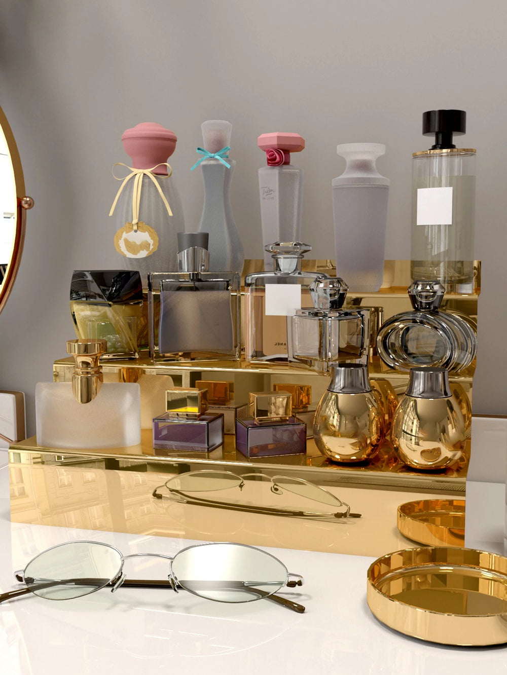 Bringen Sie Luxus in Ihren Raum mit diesem Golden Mirror Acryl-Organizer, entworfen zur eleganten Anordnung Ihrer Essenzen.