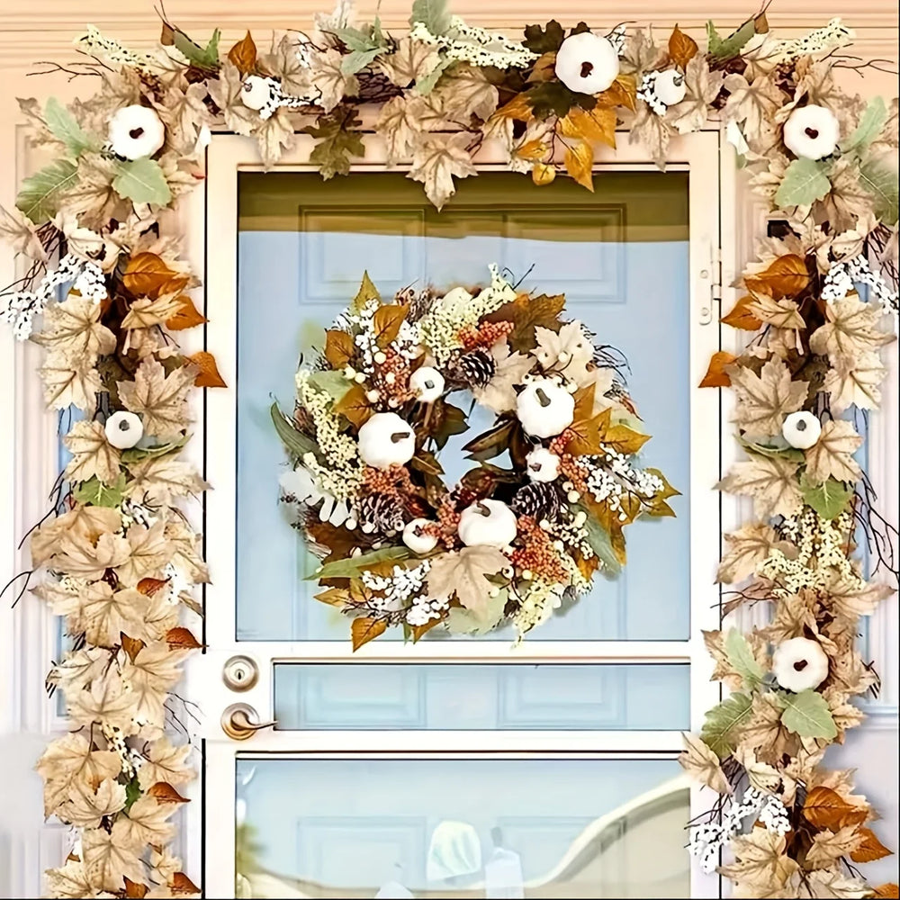 Verwandeln Sie Ihr Zuhause in eine Oase der Wärme mit unserem Ahornblatt- und Kürbiskranz. Dieser Kranz fängt perfekt die Essenz des Herbstes ein und ist Ihr Deko-Highlight für saisonale Feste.