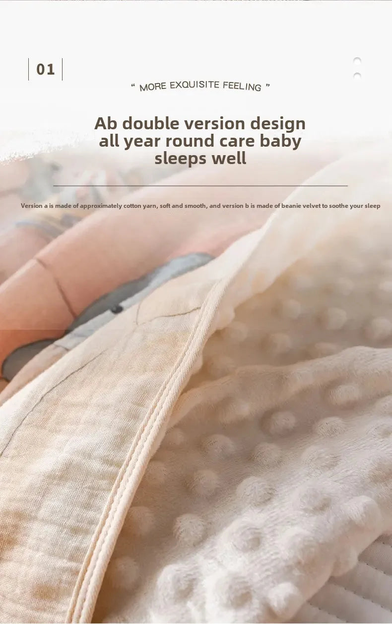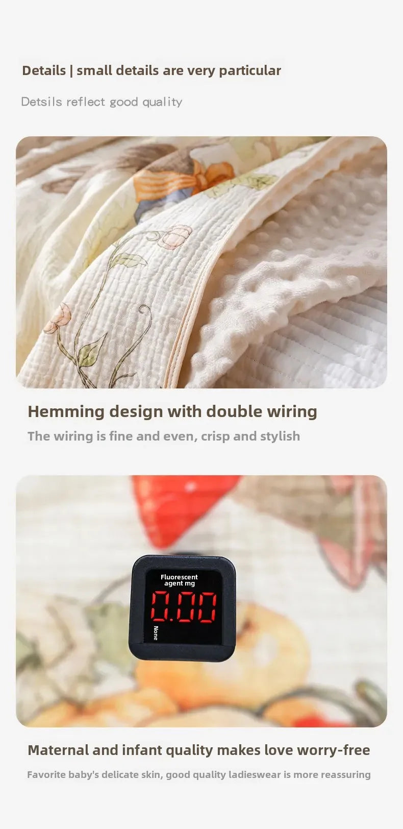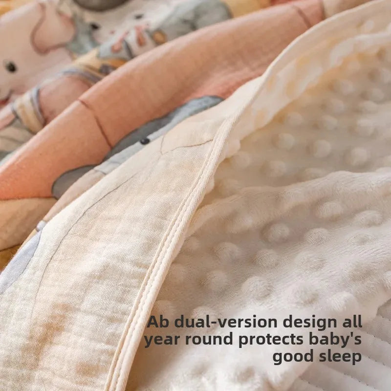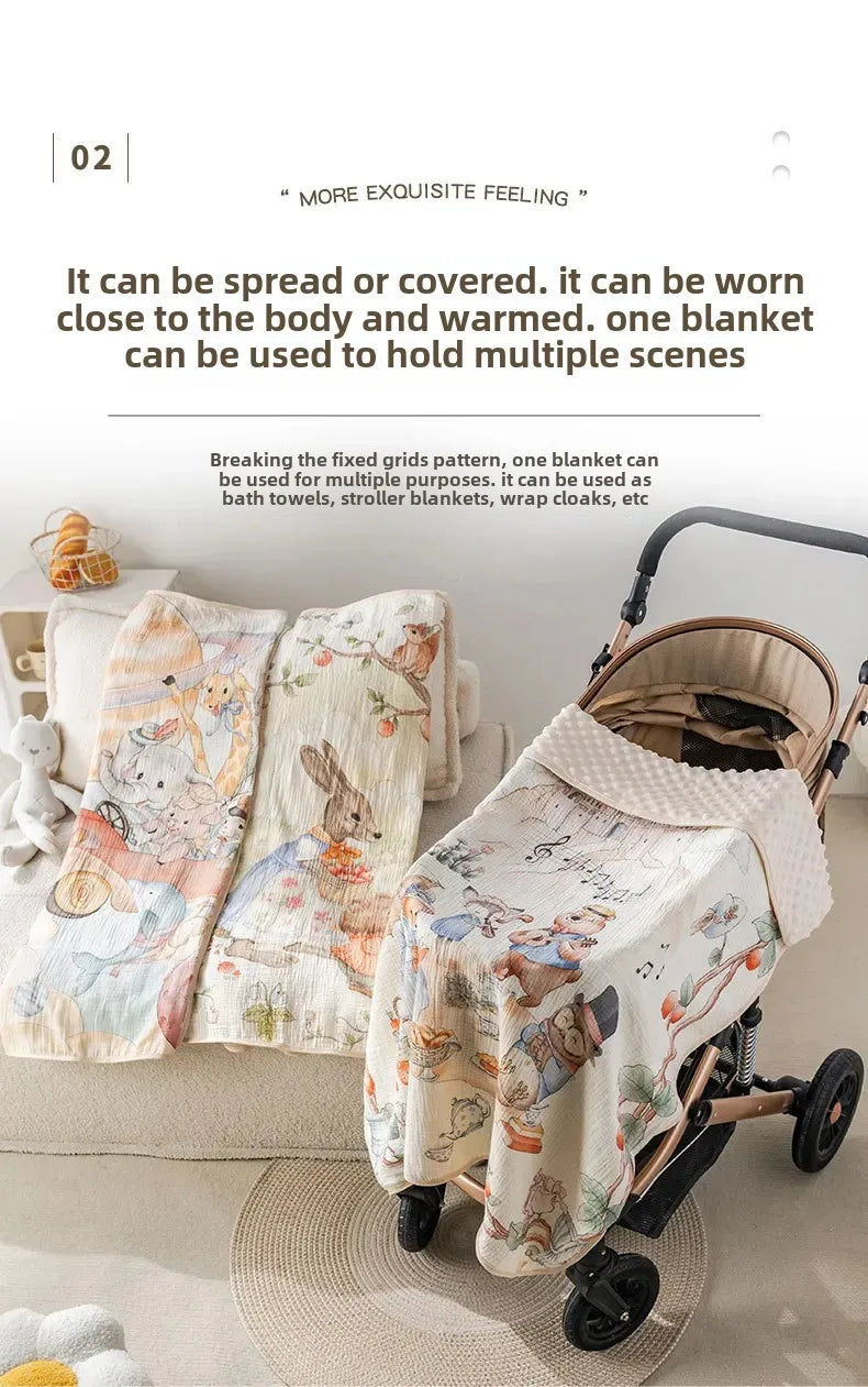 Erleben Sie die sanfte Umarmung unserer Babydecke aus Baumwollgaze, die Ihr Kind durch jeden saisonalen Wechsel begleitet.