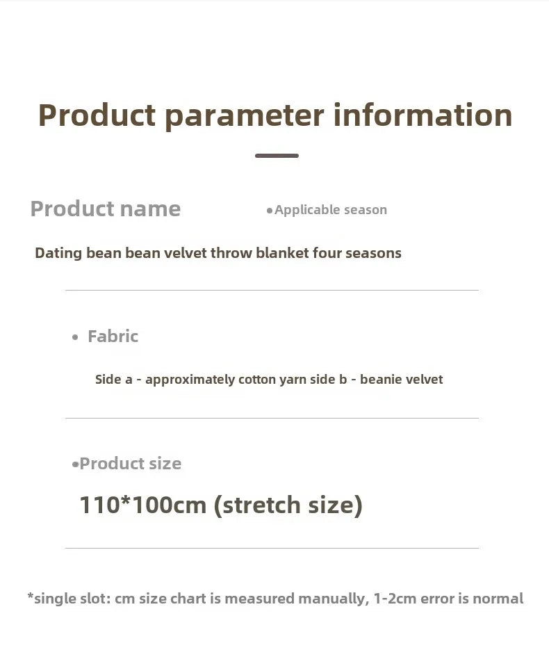 • Eignung : Perfekt für Neugeborene und Kinder, diese Decke ist eine vielseitige Ergänzung zur Sammlung Ihres Kindes.• Design und Stil : Das Design aus Bohnenvelours verleiht einen Hauch von Eleganz und bietet gleichzeitig Praktikabilität, was es zu einer stilvollen Wahl für jedes Kinderzimmer macht.• Saisonale Vielseitigkeit : Ideal für Frühling und Herbst, bietet diese Babydecke Komfort in den wärmeren Monaten und hält Ihr Kleines gemütlich.• Materialqualität : Aus hochwertigen Materialien gefertigt, gewährleistet diese Decke Langlebigkeit und Weichheit auf der Haut Ihres Babys.Grösse: 110 * 100cm