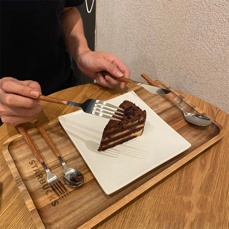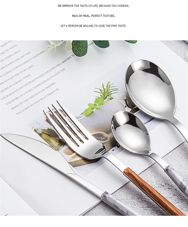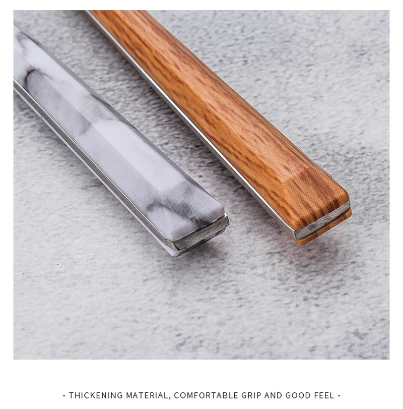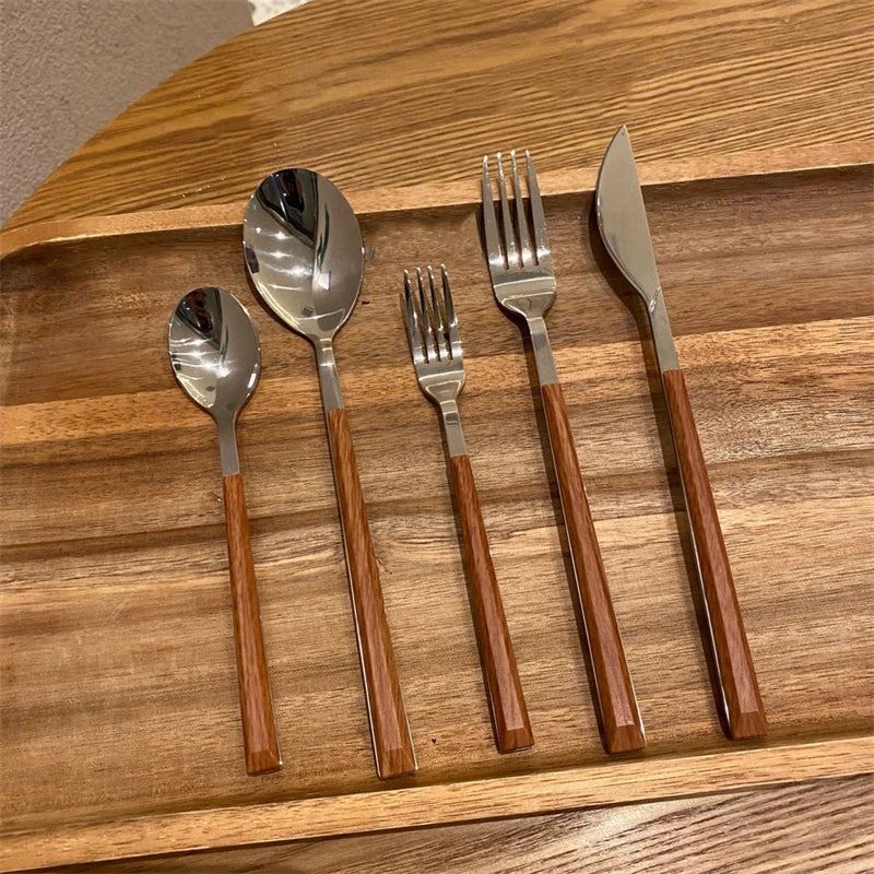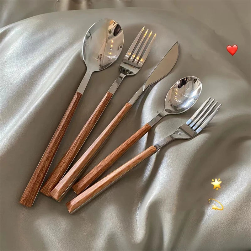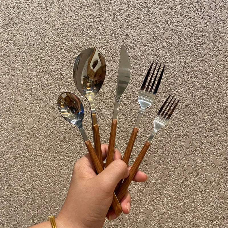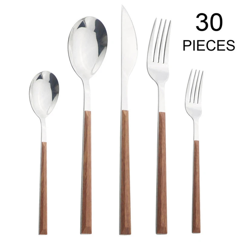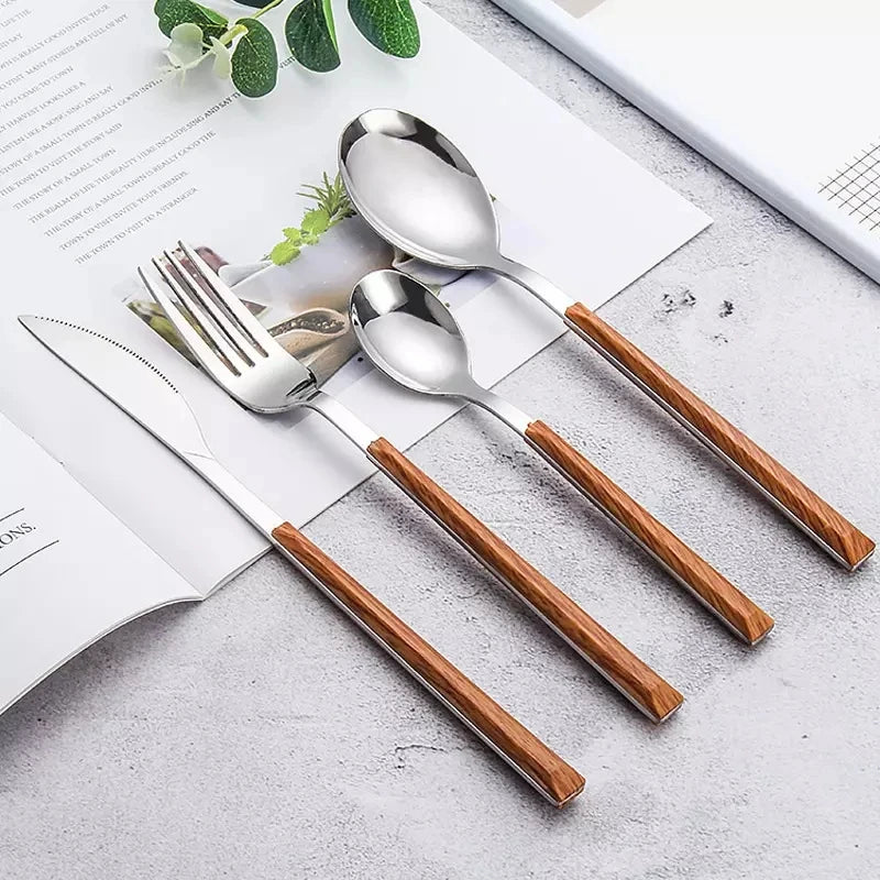 Das Set besteht aus 304 Edelstahl mit einem Holzimitat-Griff.
