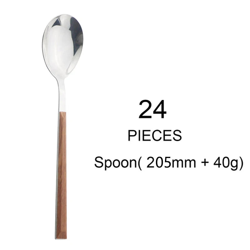Jedes Set enthält eine Vielzahl von Utensilien, sodass Sie alles haben, was Sie für ein komplettes Esserlebnis benötigen. Der braune Griff verleiht einen Hauch von Raffinesse, während der Edelstahl Langlebigkeit und einfache Reinigung gewährleistet.