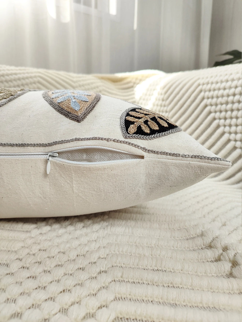 Präsentieren Sie einen stilvollen Kissenbezug, der Ihr Wohnzimmerdekor mit eleganter Blattstickerei auf langlebigem Canvas-Gewebe aufwertet.