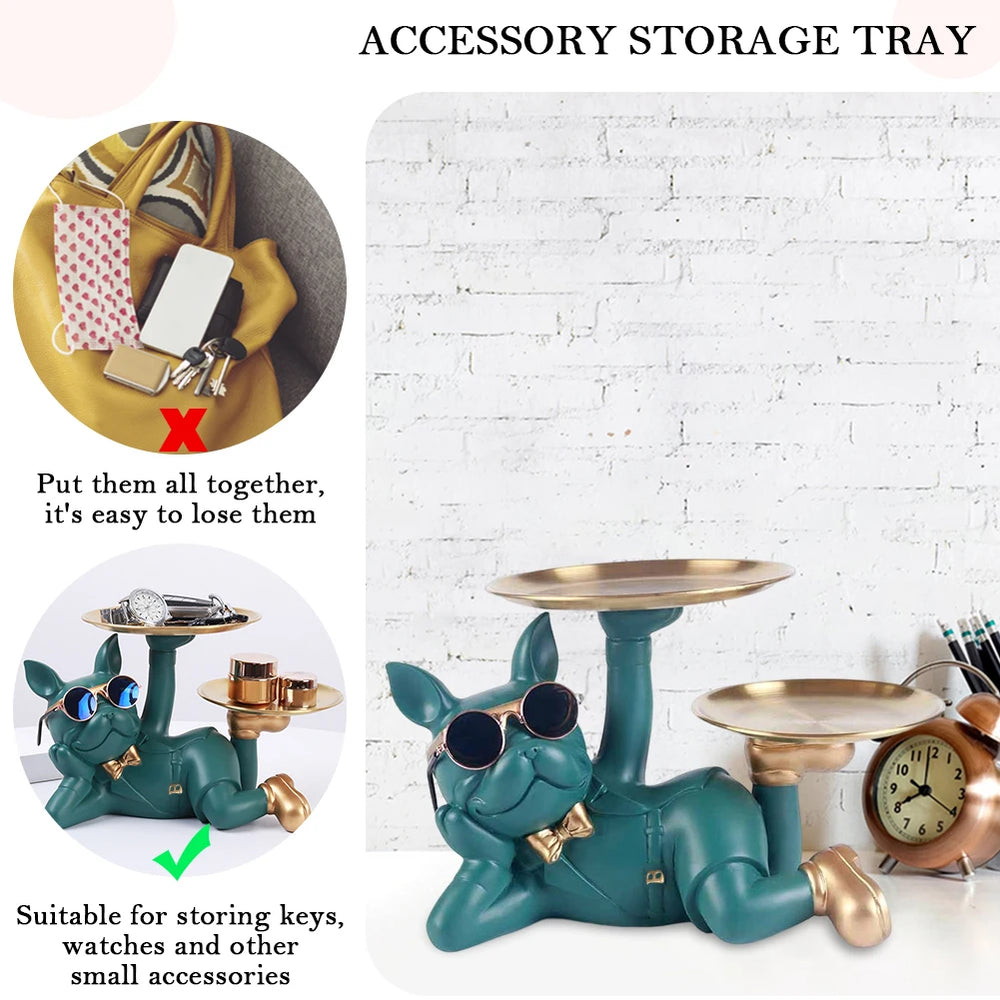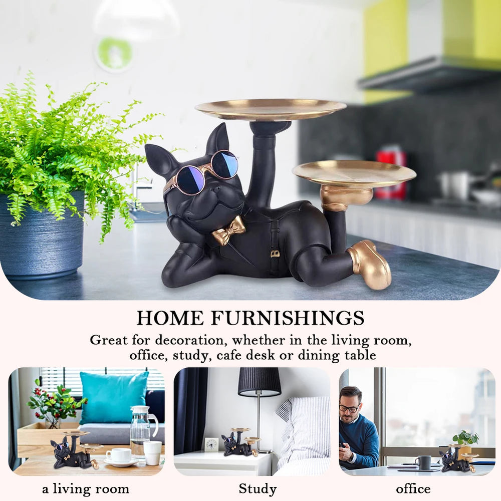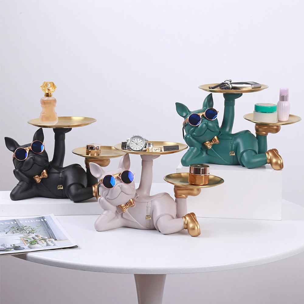 Bereichern Sie Ihr Zuhause mit einem Stück, das künstlerisches Design einer Bulldoggenfigur mit Praktikabilität durch ein Ablagetablett verbindet. Diese einzigartige Skulptur dient nicht nur als Dekoration, sondern auch als praktische Aufbewahrungslösung für verschiedenste kleine Gegenstände in Ihrem Zuhause.