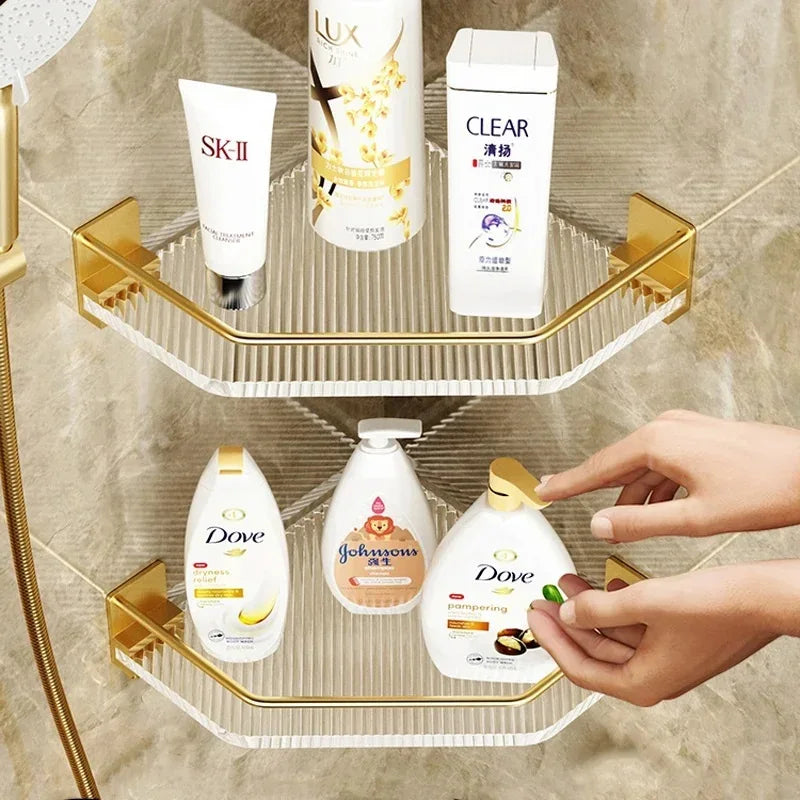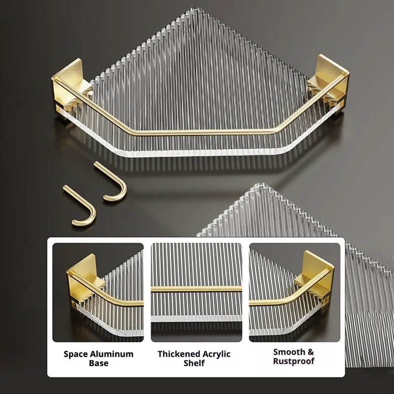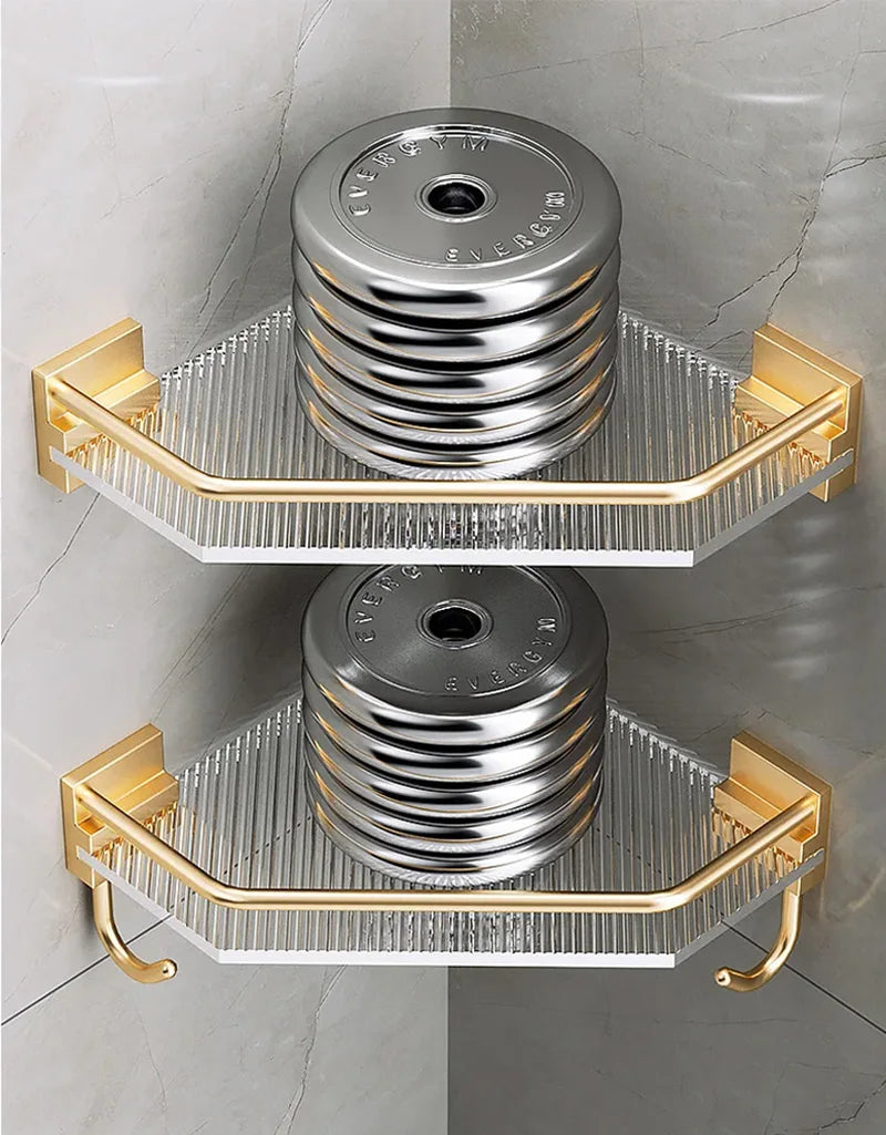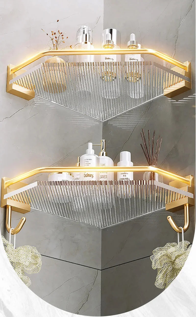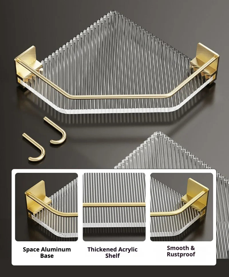 Verbessern Sie Ihr Badezimmer mit unserer Eckduschablage aus Gold Acryl, die ein elegantes Design und eine bohrfreie Installation bietet.