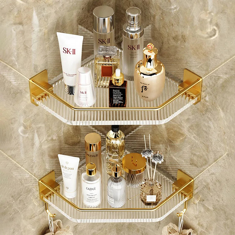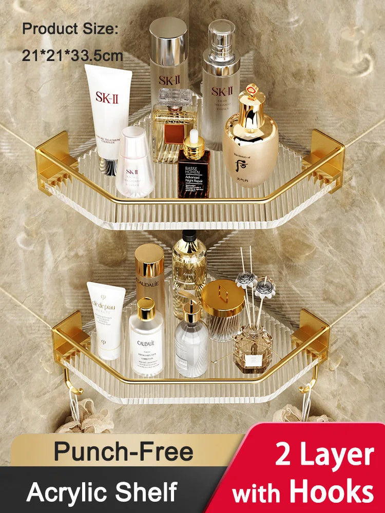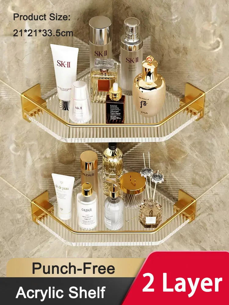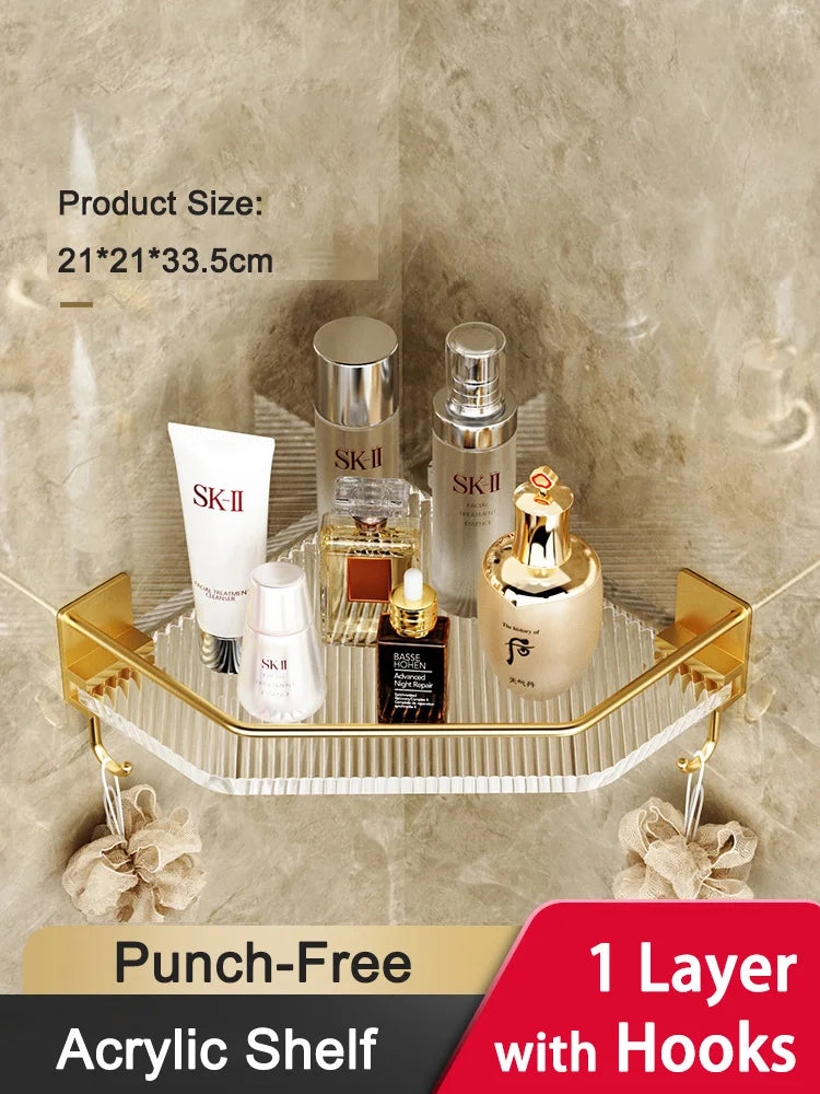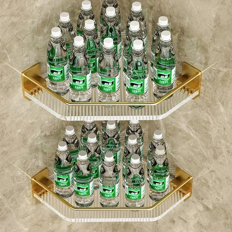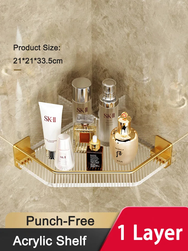 Verbessern Sie Ihr Badezimmer mit unserer Eckduschablage aus Gold Acryl, die ein elegantes Design und eine bohrfreie Installation bietet.