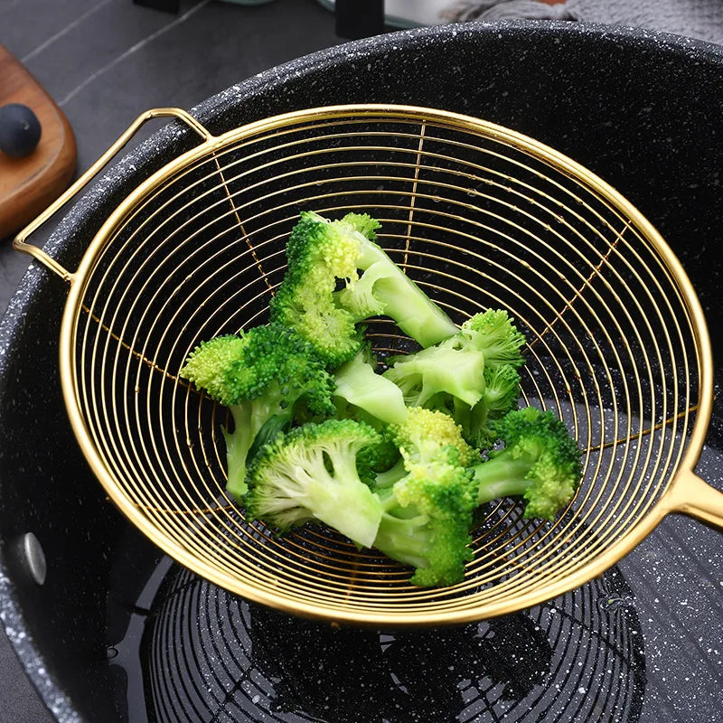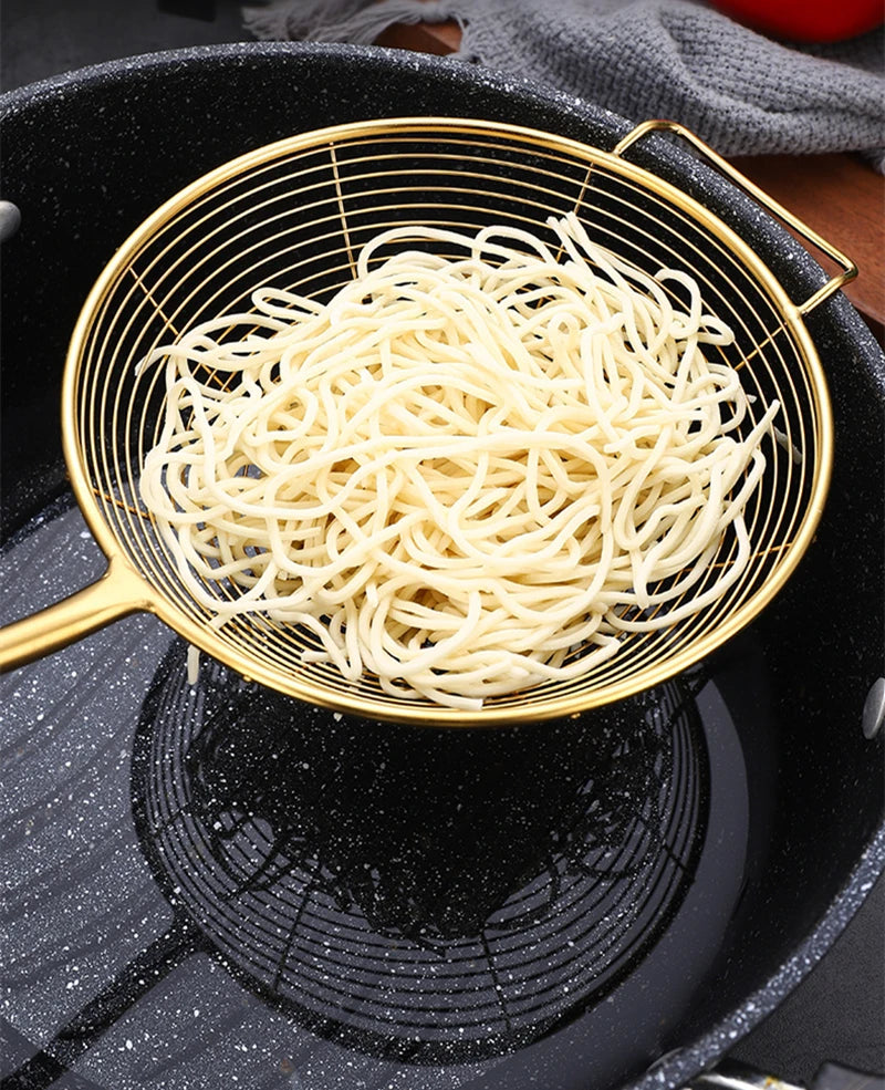 2. Drahtsieb: Das konkave Netz fängt Lebensmittel sicher auf, während Öl und andere Rückstände freigesetzt werden. Perfekt zum Frittieren von Lebensmitteln wie Pommes Frites, Hähnchenschenkel und zum Aufnehmen von Nudeln, Spätzle, Pasta, Spaghetti und mehr.
