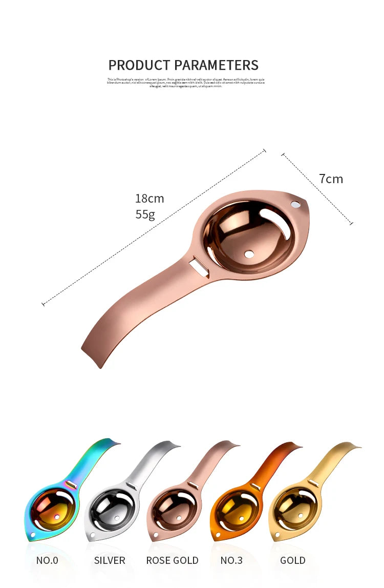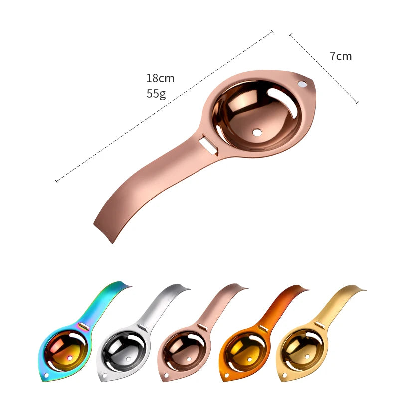 Gefertigt aus hochwertigem 410 Edelstahl, zeichnet sich dieser Eidottertrenner durch ein elegantes Design in Silber, Gold, Roségold und Regenbogen aus. Seine Grösse von 17 cm x 7 cm und ein Gewicht von 55g machen ihn zu einem perfekten kompakten Werkzeug für effizientes Eitrennen.