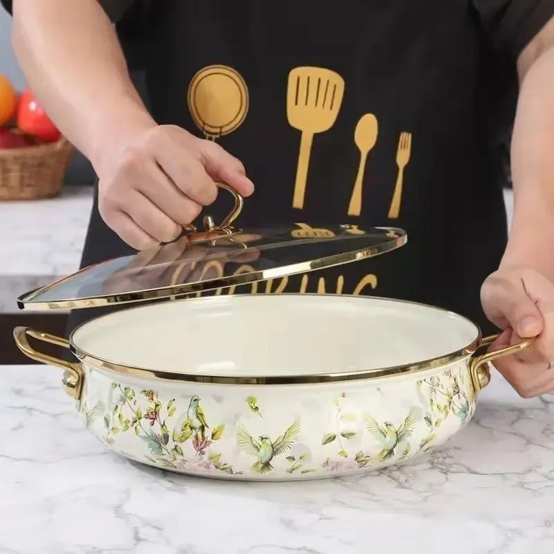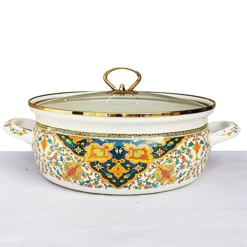 Mit einem klaren Glasdeckel für einfaches Beobachten des Essens während des Kochens, ist dieser Emailtopf mit exquisiten Blumen-/Kochmustern verziert. Er verleiht Ihrer Küche einen stilvollen Touch und bietet funktionale Ästhetik.