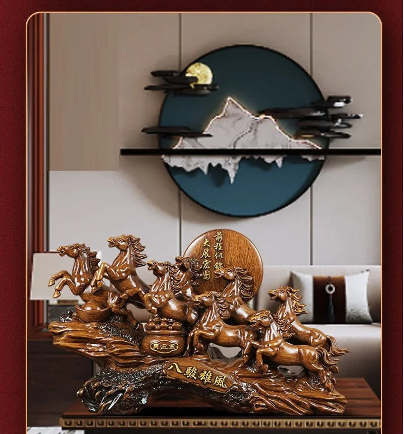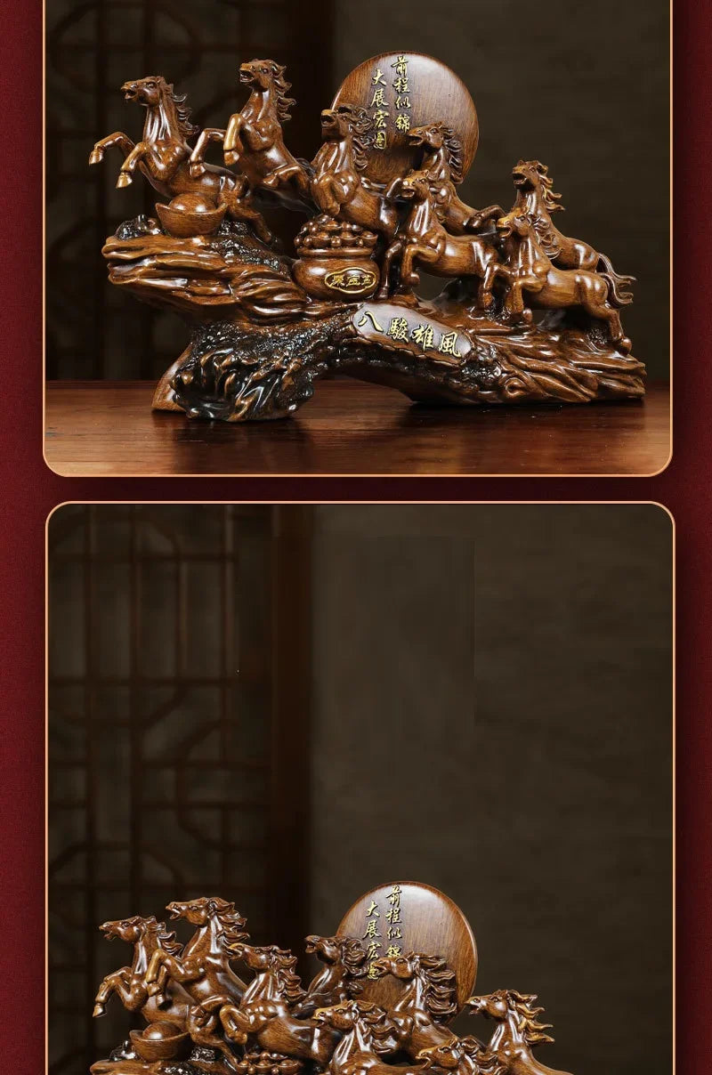 Unser chinesisches Acht-Pferd-Ornament ist sorgfältig aus strapazierfähigem Harz gefertigt und bietet reiche Details und ein harmonisches Thema, das den Geist von Wohlstand und Energie einfängt.
