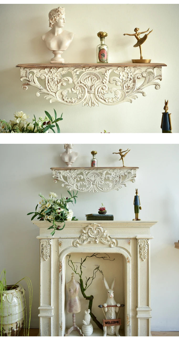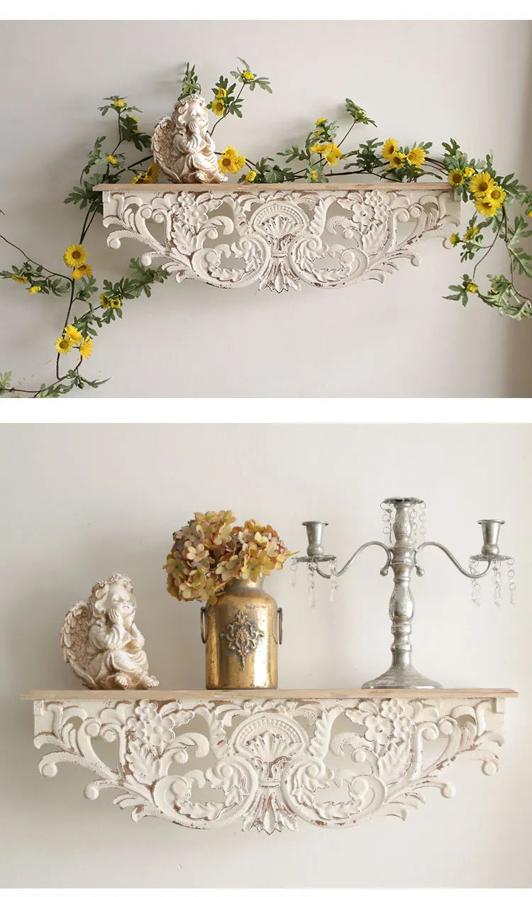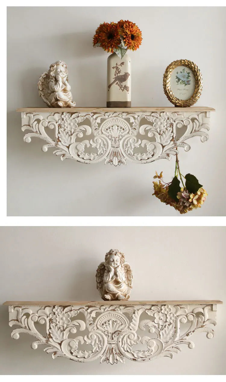 Beschreibung: Dieses wunderschön gestaltete Korbel-Mantelregal kombiniert Massivholz und langlebiges MDF, um sowohl authentischen rustikalen Charme als auch langanhaltende Stärke zu bieten. Die verwitterte weisse Oberfläche hebt das filigrane Design im französischen Landhausstil hervor und macht jedes Stück einzigartig gealtert und voller Charakter. Hergestellt aus einer Mischung aus hochwertigem Holz und mitteldichtem Faserboard (MDF) für verbesserte Haltbarkeit und Stabilität. Die glatte MDF-Rückwand bietet eine stabile Basis, während die Holzkorbel authentische Schnitzereien mit einem vintage verwitterten Look zeigen. Ideal zum Ausstellen von Fotos, Pflanzen, Trophäen, Büchern und mehr, bringt dieses Regal eine warme, europäisch inspirierte Eleganz in jeden Raum. Die verwitterte Oberfläche variiert mit jedem Stück und sorgt für eine einzigartige, shabby-chic Aussage in Ihrer Wohnkultur. Geniessen Sie die perfekte Mischung aus traditioneller Handwerkskunst und moderner Materialinnovation für ein charmantes und dennoch praktisches Akzentstück.