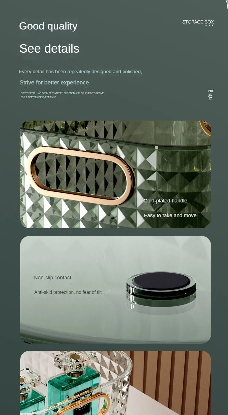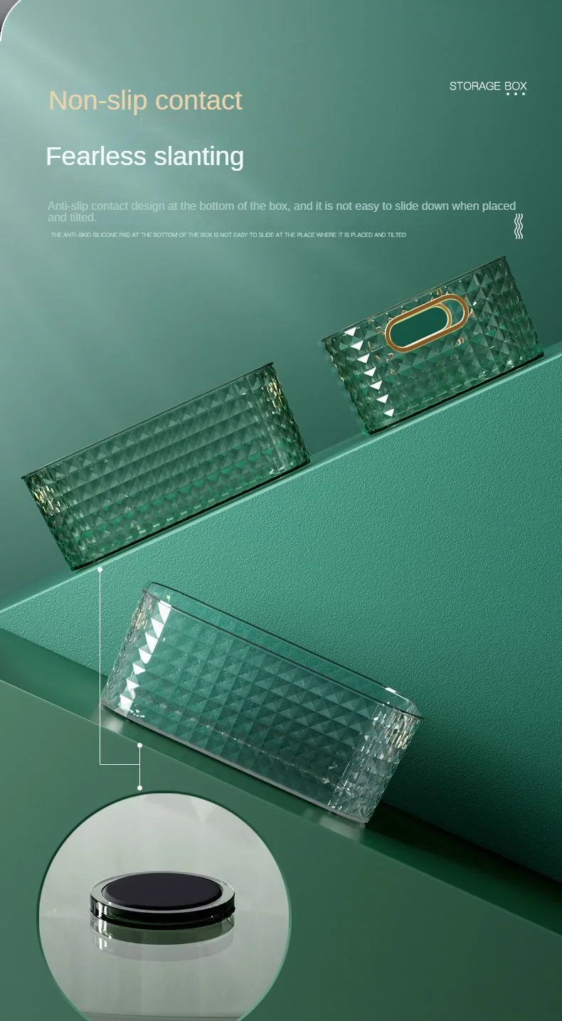 Ob auf Ihrer Küchenarbeitsplatte oder im Badezimmer, die Futurismus Box verleiht jedem Raum einen Hauch von moderner Eleganz. Ihre Tragbarkeit ermöglicht eine einfache Neupositionierung dort, wo Organisation benötigt wird, und bringt Stil und Ordnung in Ihren Alltag.