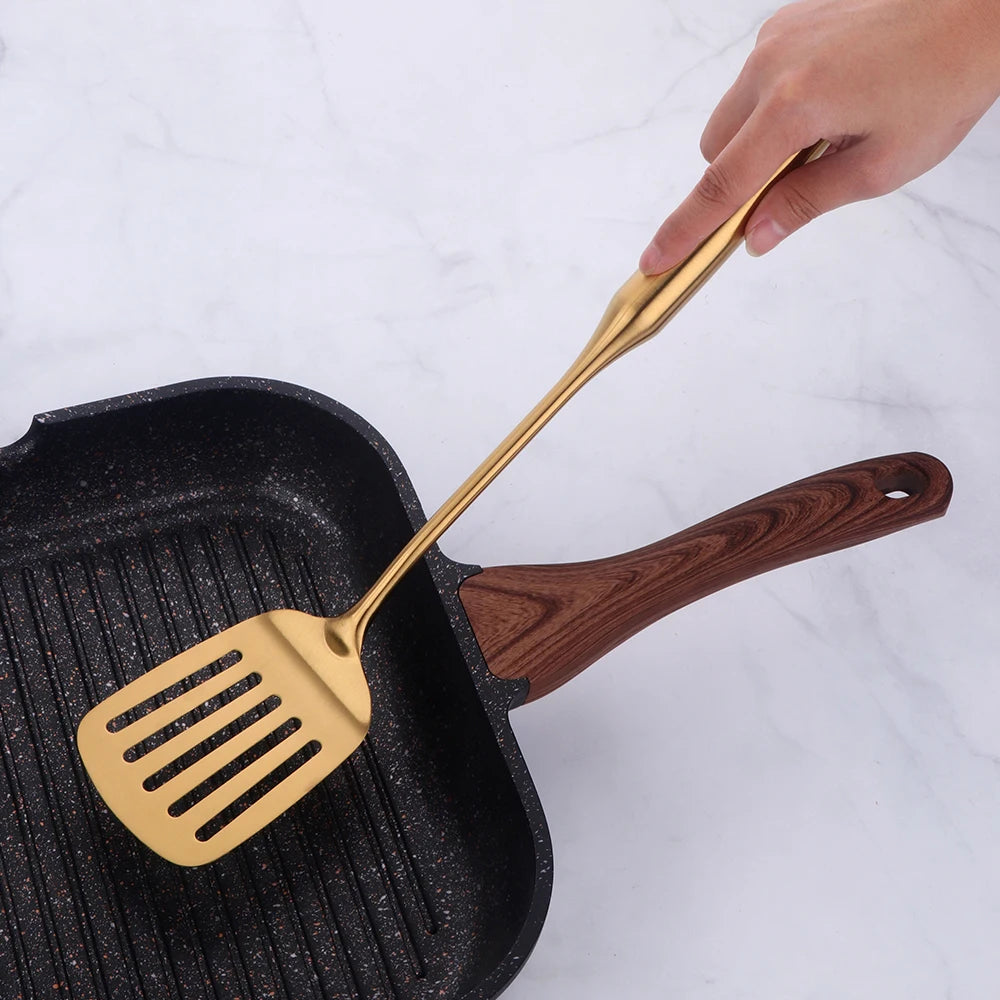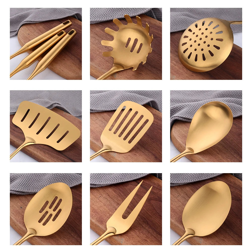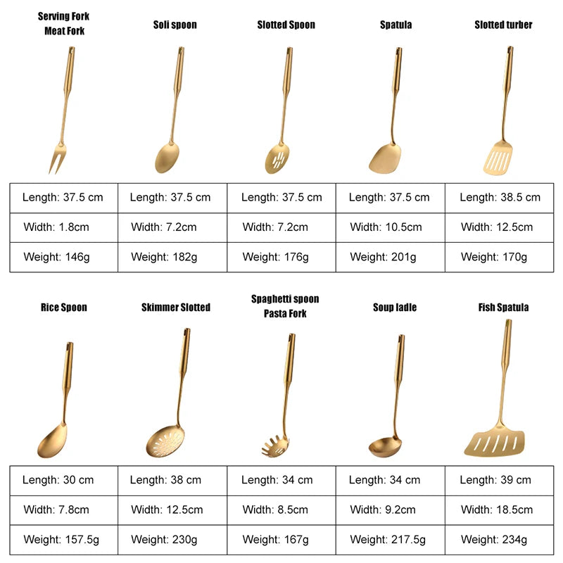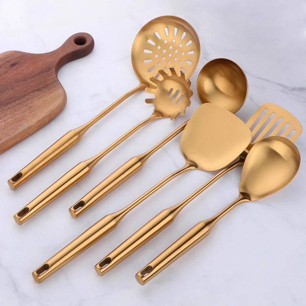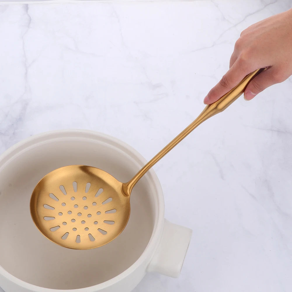 Steigern Sie den Stil Ihrer Küche mit unseren goldenen Edelstahl-Kochwerkzeugen. Für Eleganz und Funktionalität entwickelt.
