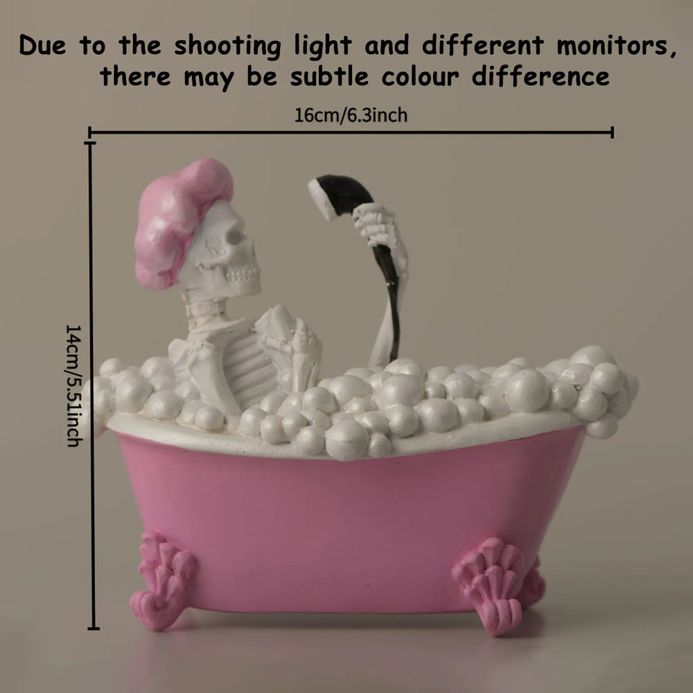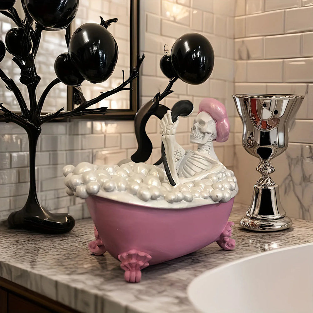 Fügen Sie Ihrer Wohnkultur mit diesem Skelett in einer Badewanne spielerischen und unheimlichen Charme hinzu, perfekt für Halloween.