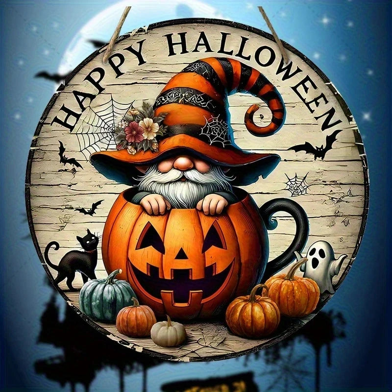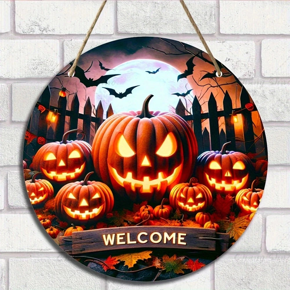 Verleihen Sie Ihrem Halloween-Dekor mit diesem charmanten runden Holzschild mehr Eleganz, ideal für den Innen- und Ausseneinsatz.