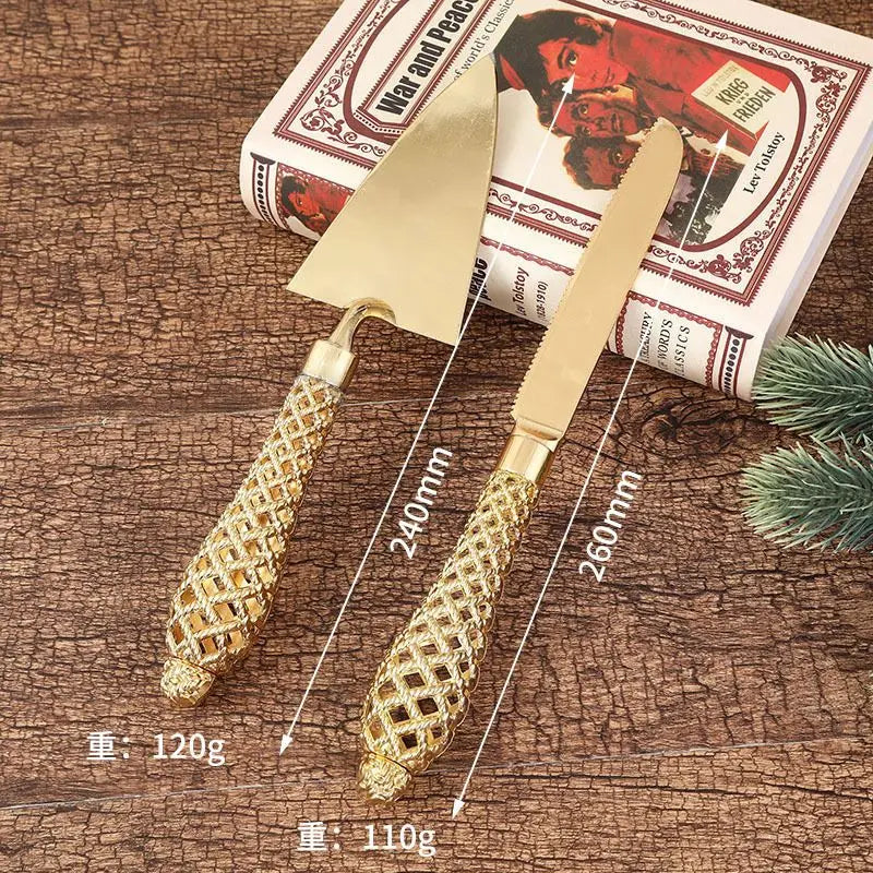 Dieses elegante Kuchen-Messer-Set ist für Feierlichkeiten der Liebe und Freude ausgelegt und verleiht jedem Ereignis eine unvergessliche Note. Sein europäisches Design und die Goldbeschichtung verleihen Ihrer Veranstaltung einen Hauch von Luxus und sorgen für eine atemberaubende Präsentation bei jedem Kuchenanschnitt. Personalisieren Sie Ihr Set, um es einzigartig zu machen, und schätzen Sie seine Funktionalität über Jahre hinweg.