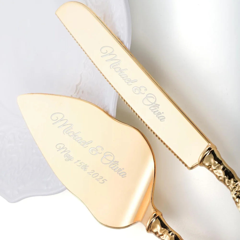 Das Set umfasst ein sorgfältig gefertigtes Tortenmesser und einen Servierspatel, die für Leichtigkeit und Schönheit entworfen wurden. Die goldene Oberfläche ergänzt sowohl moderne als auch Vintage-Themen. Machen Sie Ihr Event unvergesslich mit diesem exquisiten Hochzeitsaccessoire.