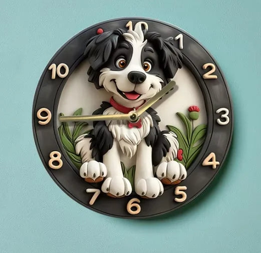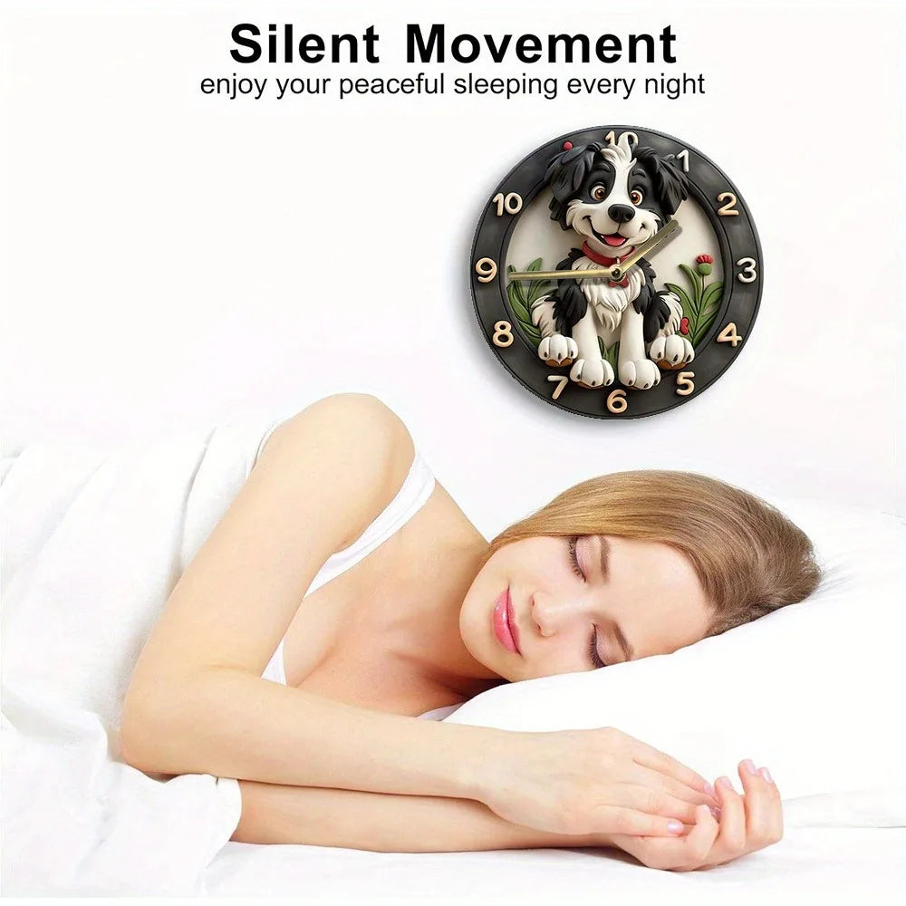 Die Holz Wanduhr misst 30x30CM und arbeitet mit einem zuverlässigen Quarzmechanismus, benötigt eine AA-Batterie (nicht enthalten). Das charmante Hundedesign verleiht Ihrem Wohnzimmer, Flur oder Büro eine spielerische Note, während es modern bleibt.