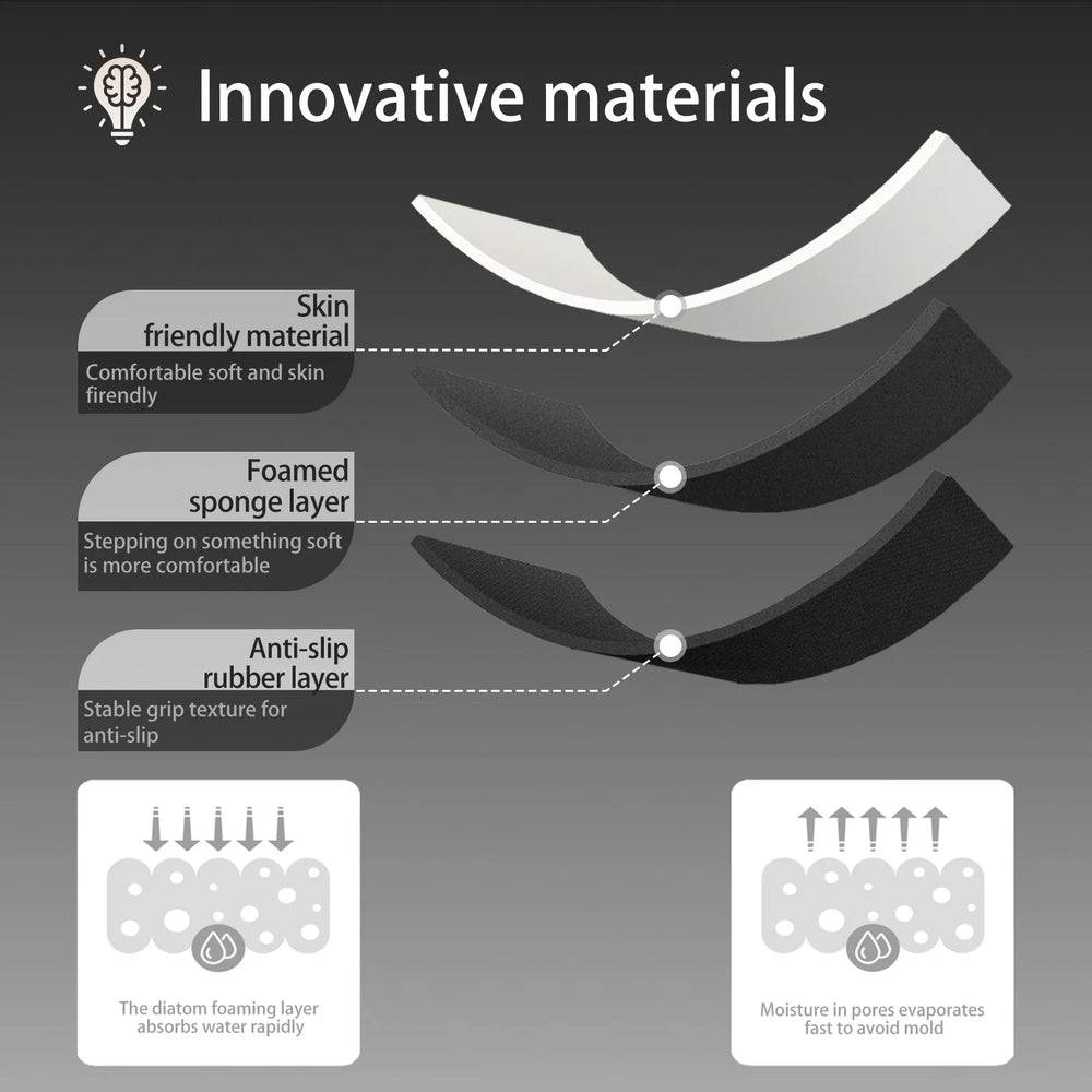 2. Die Oberfläche aus Diatomerde kann Feuchtigkeit schnell aufnehmen; Die schaumstoffabsorbierende Schicht kann Wasser sofort aufnehmen und schnell verdampfen.