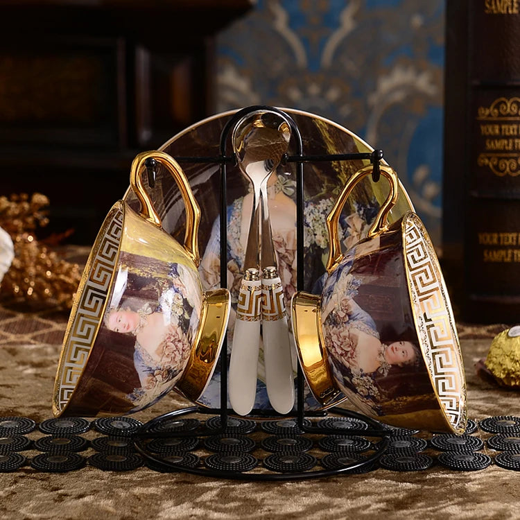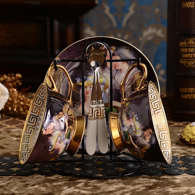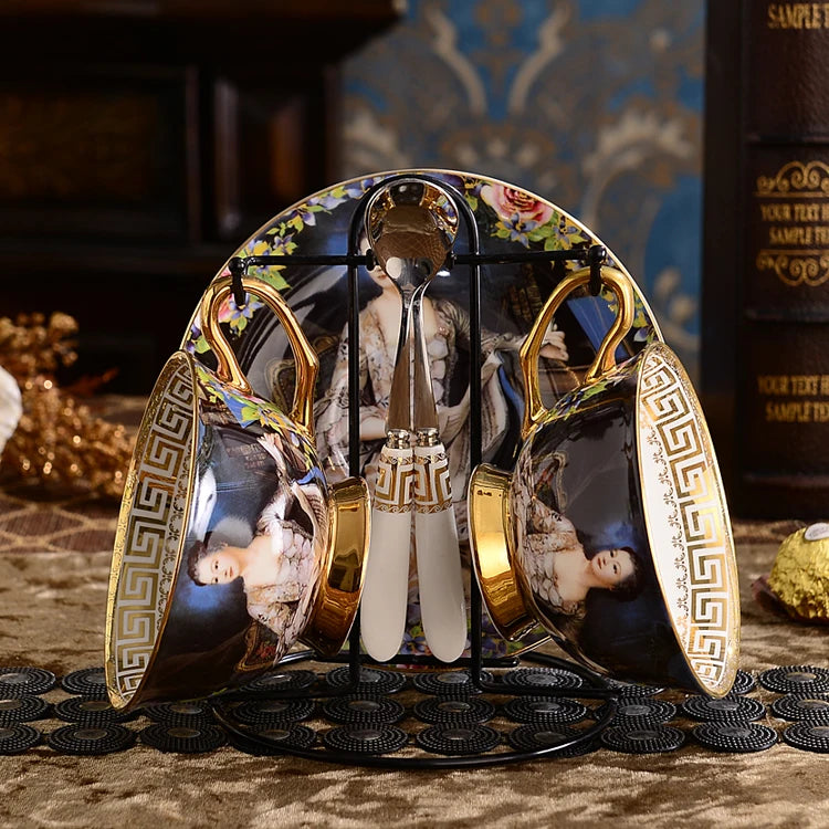 Eigenschaften: Set aus Kaffee Tassen und Untertassen aus Knochenporzellan mit luxuriösen goldenen Griffen, Vintage Kunst, mit 5 verschiedenen Gemälden. Eine Tasse + eine Untertasse + ein Löffel. Hochwertige Qualität, eine schicke Kunst und eine prächtige Dekoration für Ihr Zimmer/Ihr Haus. Sehr empfindlicher Artikel, bitte von Hand waschen, nicht im Ofen oder in der Mikrowelle verwenden!!