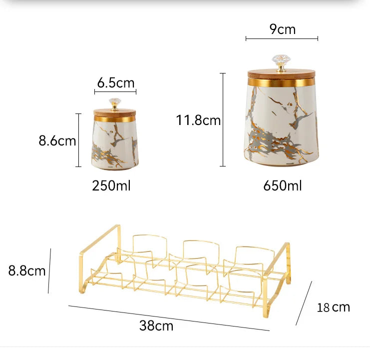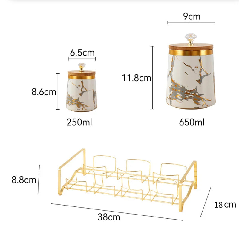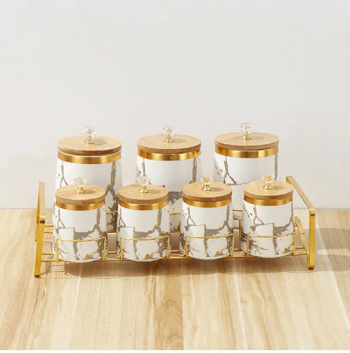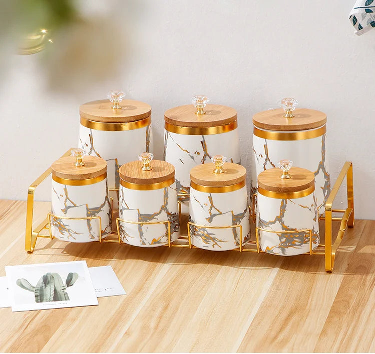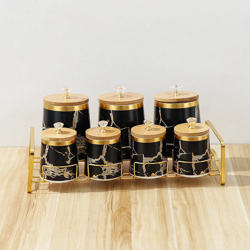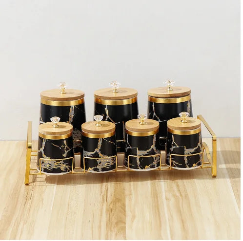 Verleihen Sie Ihrer Küche mit unseren luxuriösen Keramik-Aufbewahrungsgläsern einen Hauch von moderner Eleganz. Die exquisite goldene Marmor-Textur fügt eine anspruchsvolle Atmosphäre hinzu und hält Ihre Gewürze frisch und organisiert.