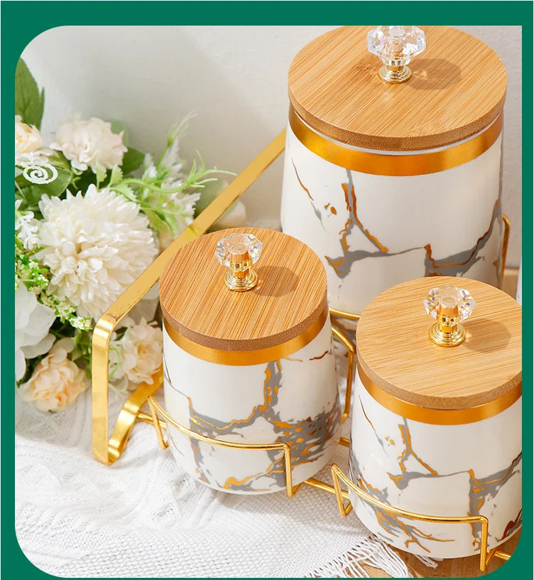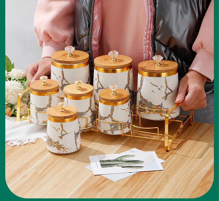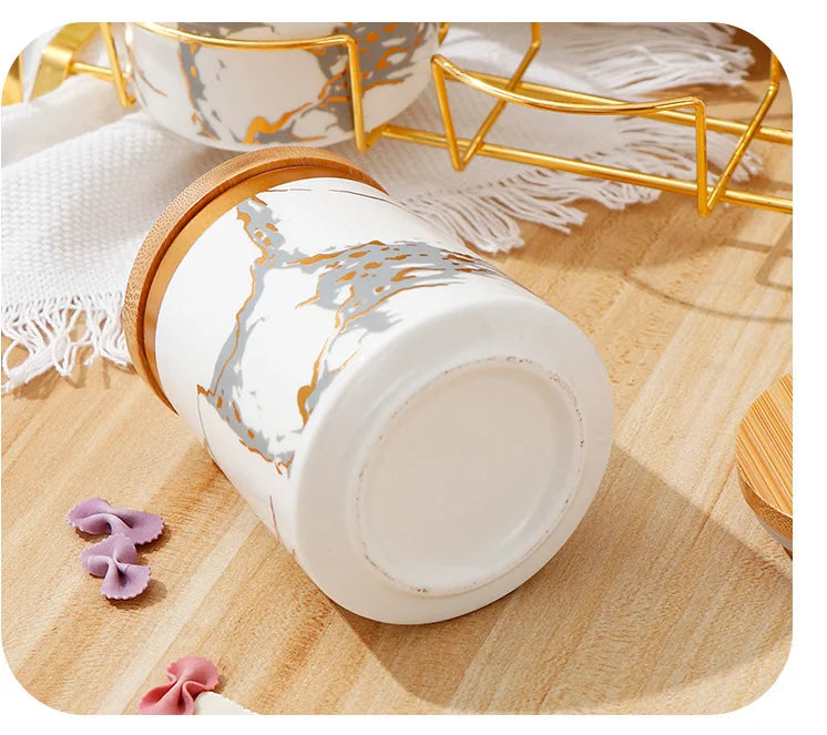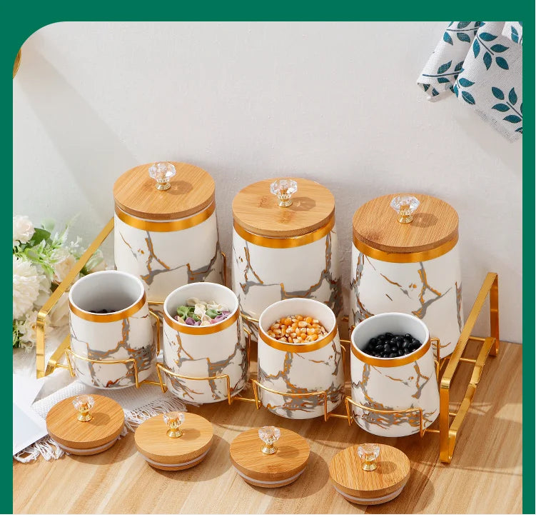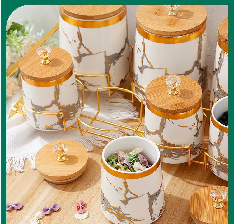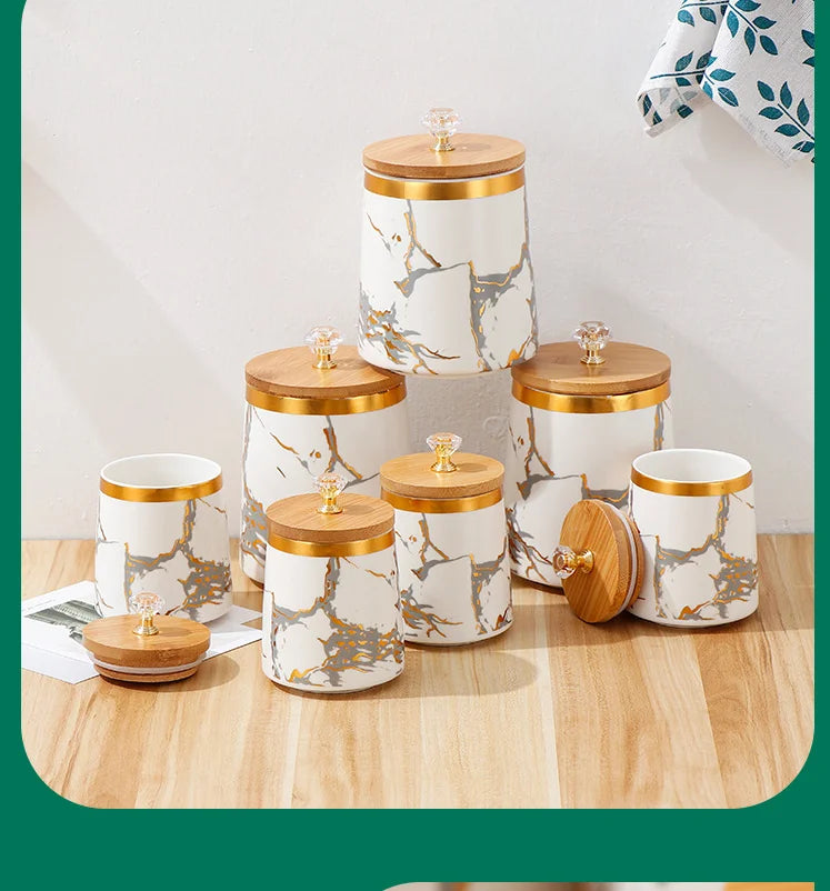 Unsere modernen Keramik-Aufbewahrungsgläser vereinen Stil und Praktikabilität und bieten Ihrer Küchendekoration mit ihrer atemberaubenden goldenen Marmortextur einen frischen Akzent.