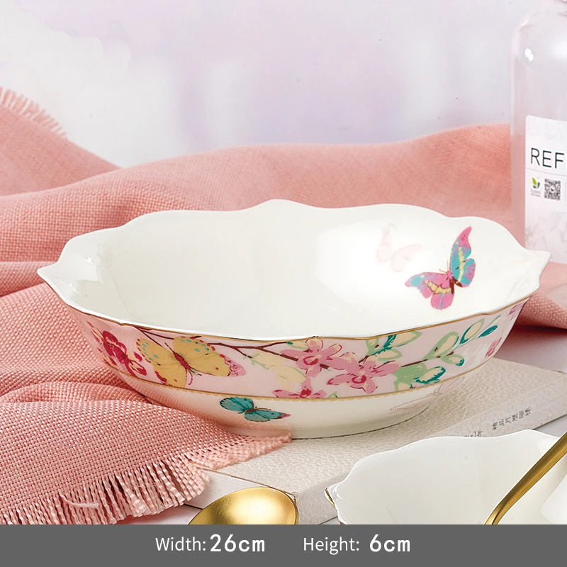Perfekt für den täglichen Gebrauch oder festliche Anlässe, fügt dieses einzigartige Set jeder Mahlzeit einen Hauch von Eleganz hinzu. Das florale Design ergänzt jedes Tischarrangement und ist ideal für Brunchs, Abendessen oder Nachmittagstees geeignet.