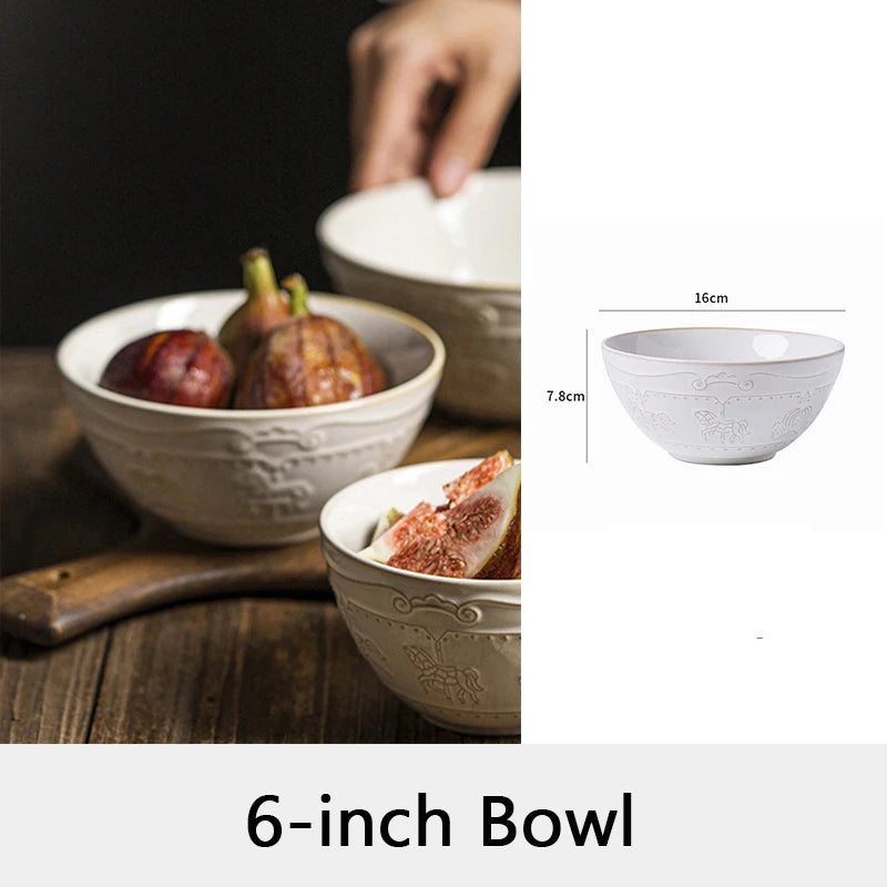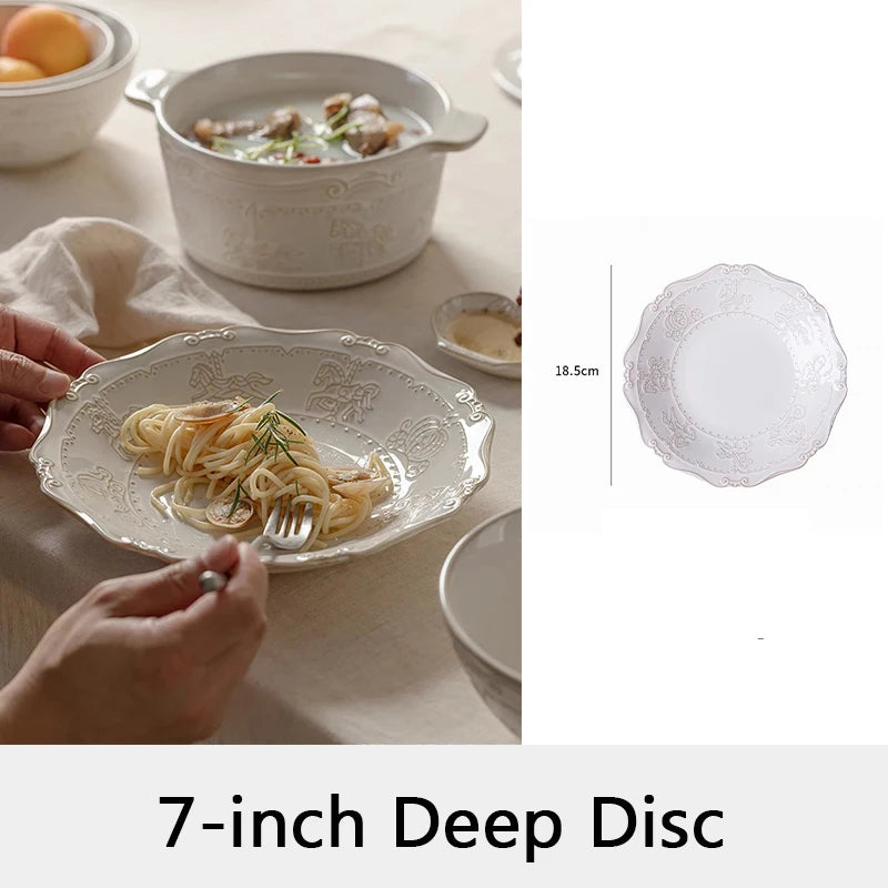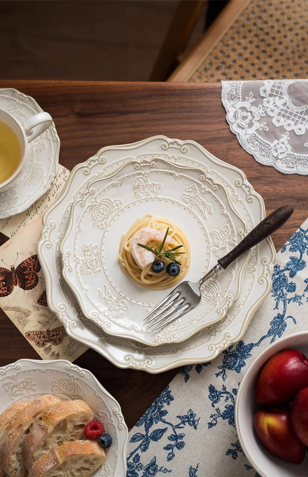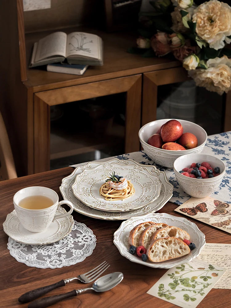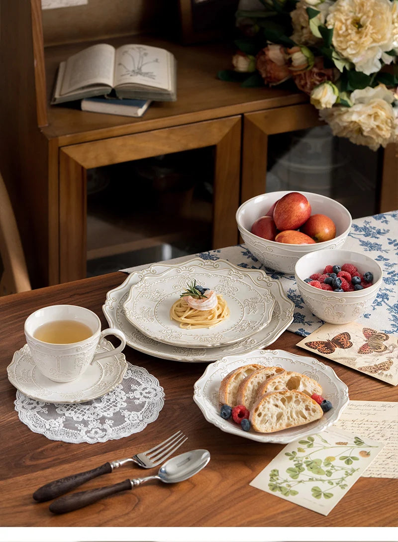 Bereichern Sie Ihr Esserlebnis mit unserem Keramikgeschirrset, das handgefertigtes Reliefdesign und vielseitige Off-White-Ästhetik bietet.