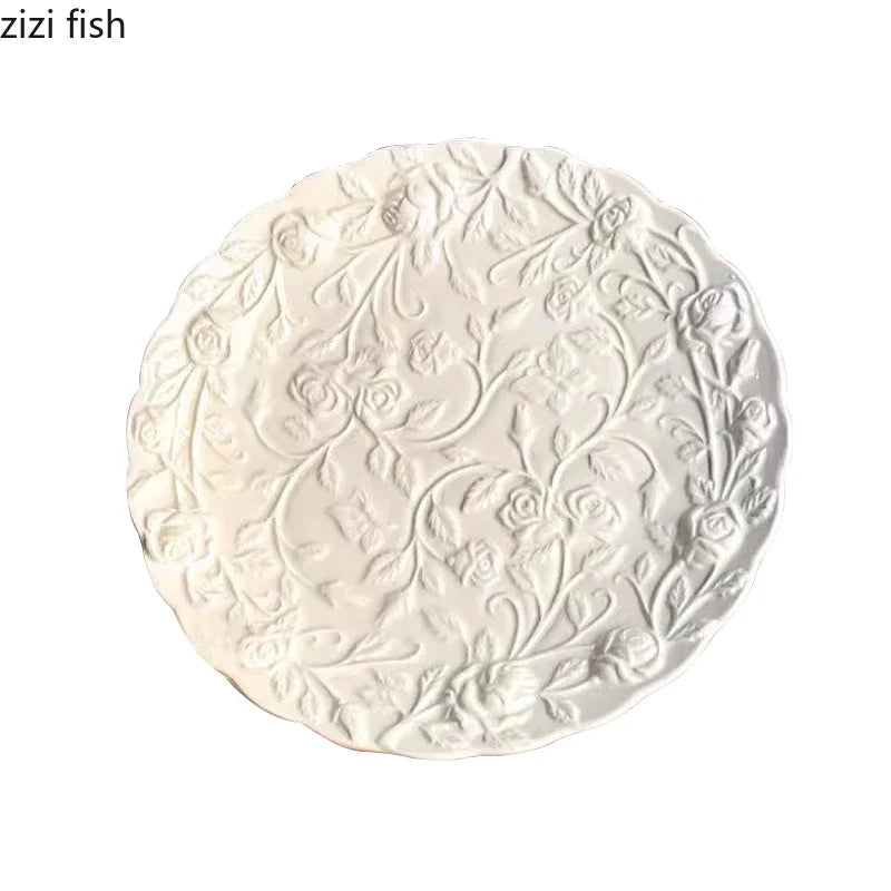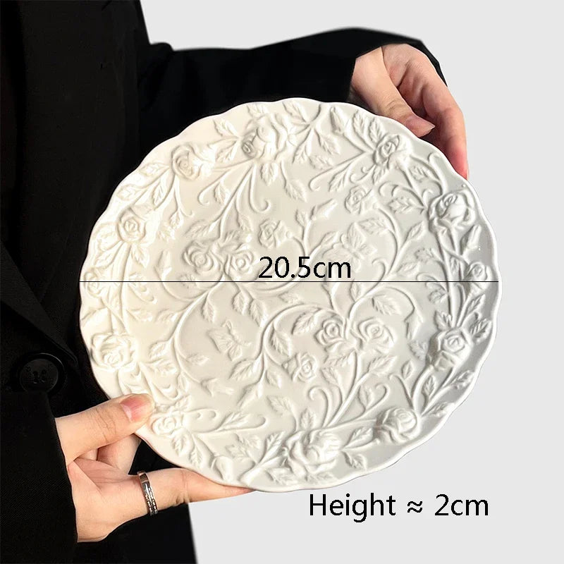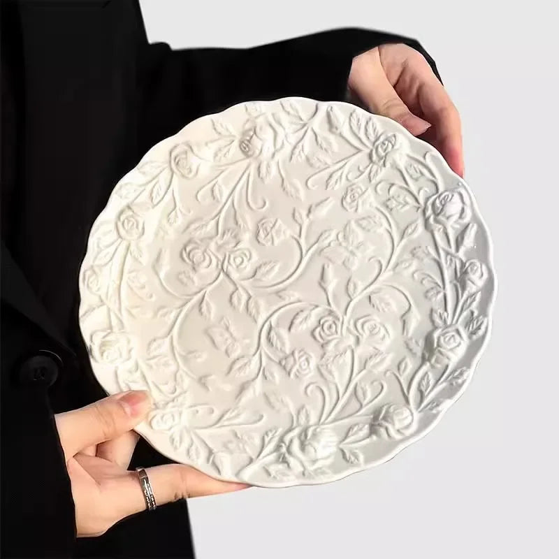 Verwandeln Sie Ihre Mahlzeiten in elegante Anlässe mit unserem Relief Rose Keramikteller. Das raffinierte florale Design verleiht Ihrem Zuhause einen Hauch von Retro-Chic, während es Ihre Lieblingsspeisen präsentiert.