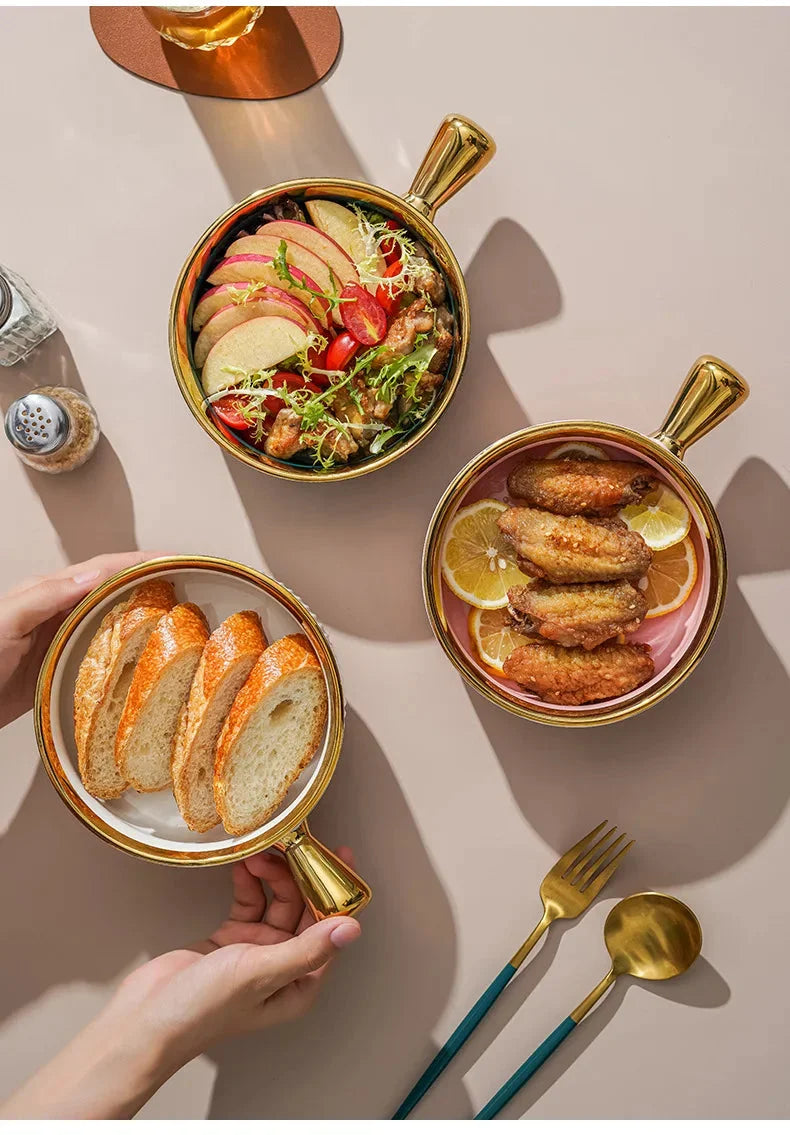 Fügen Sie Ihrem Esstisch Eleganz hinzu mit unseren keramikschalen mit Goldrand.