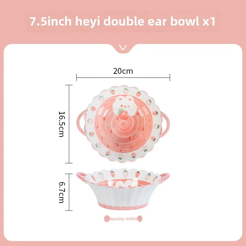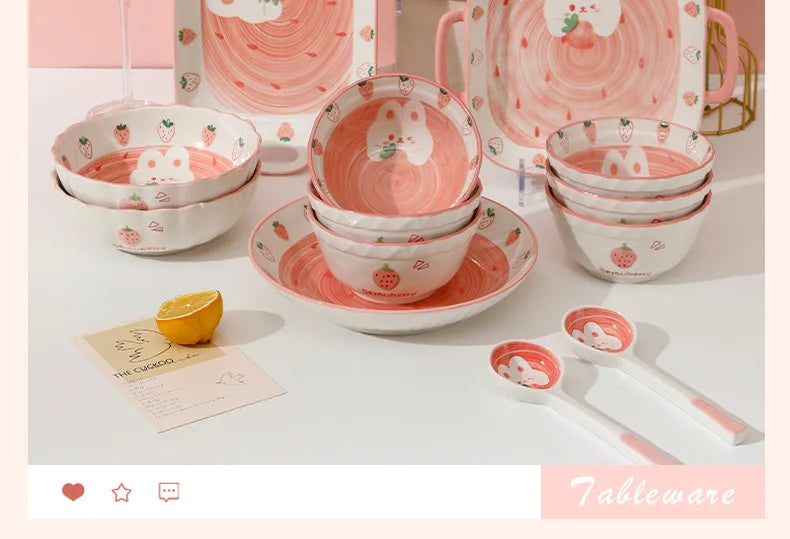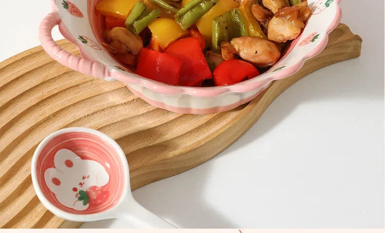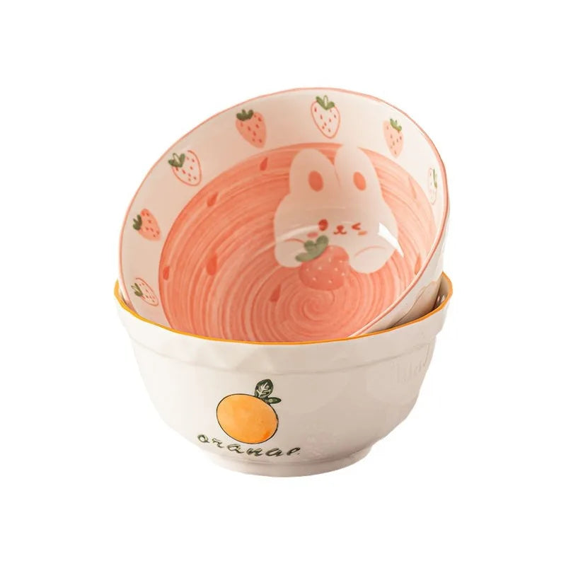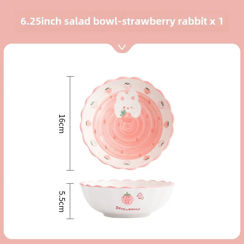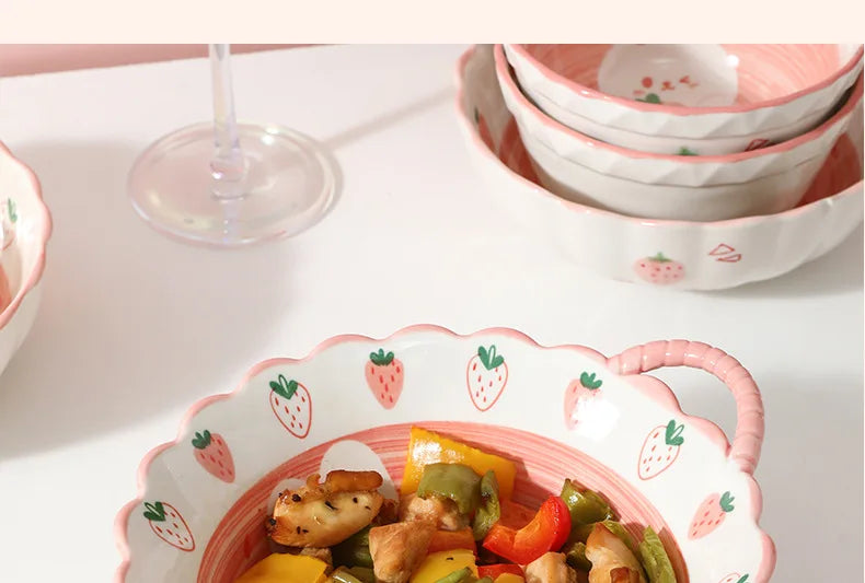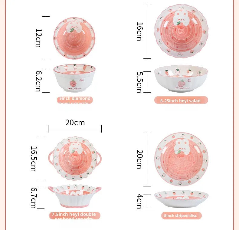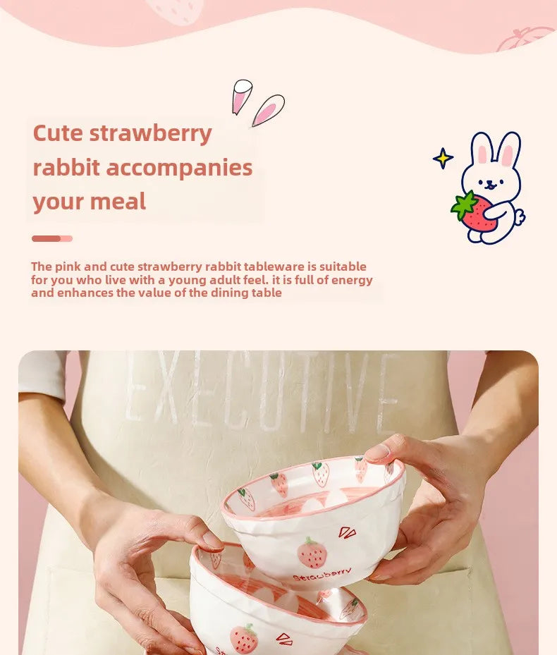 Verleihen Sie Ihrem Esserlebnis mit unseren charmanten Keramikschalen eine verspielte Eleganz. Diese Schalen mit einem verspielten Unterglasurdesign aus Erdbeeren und Kaninchen sind perfekt für jeden Anlass.