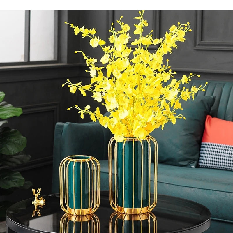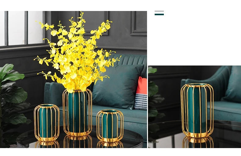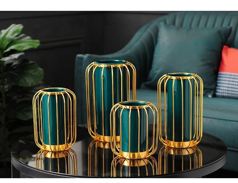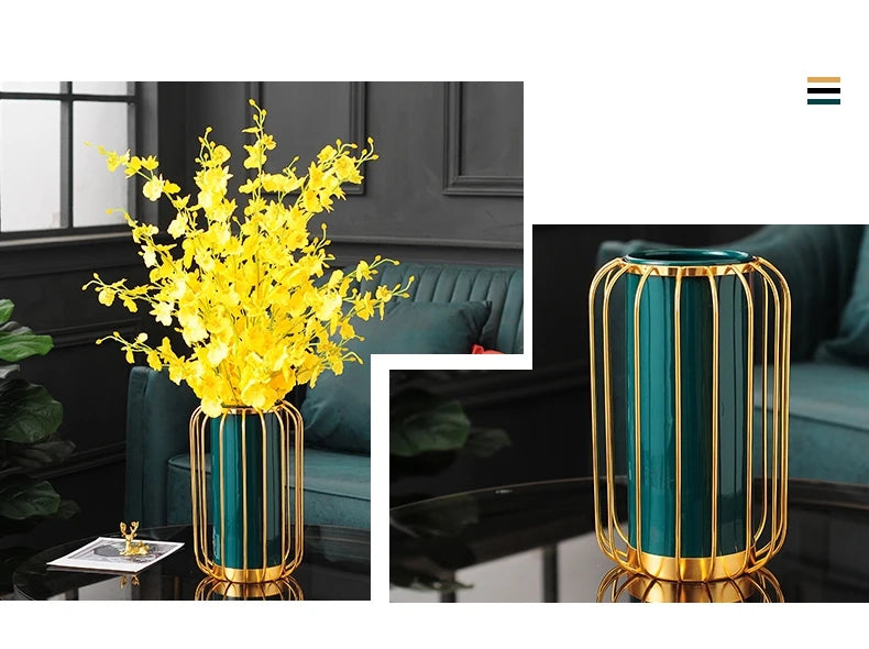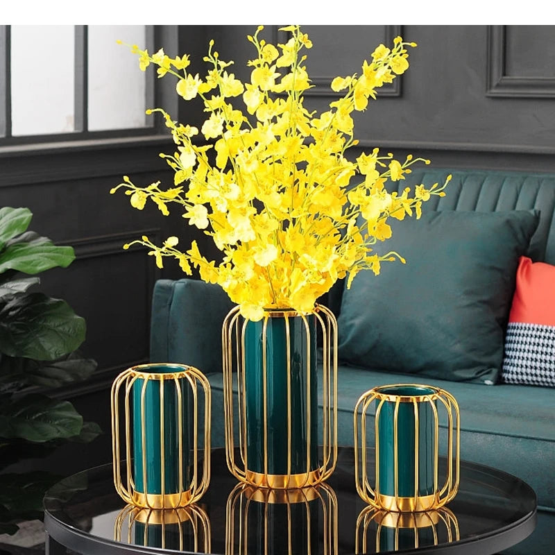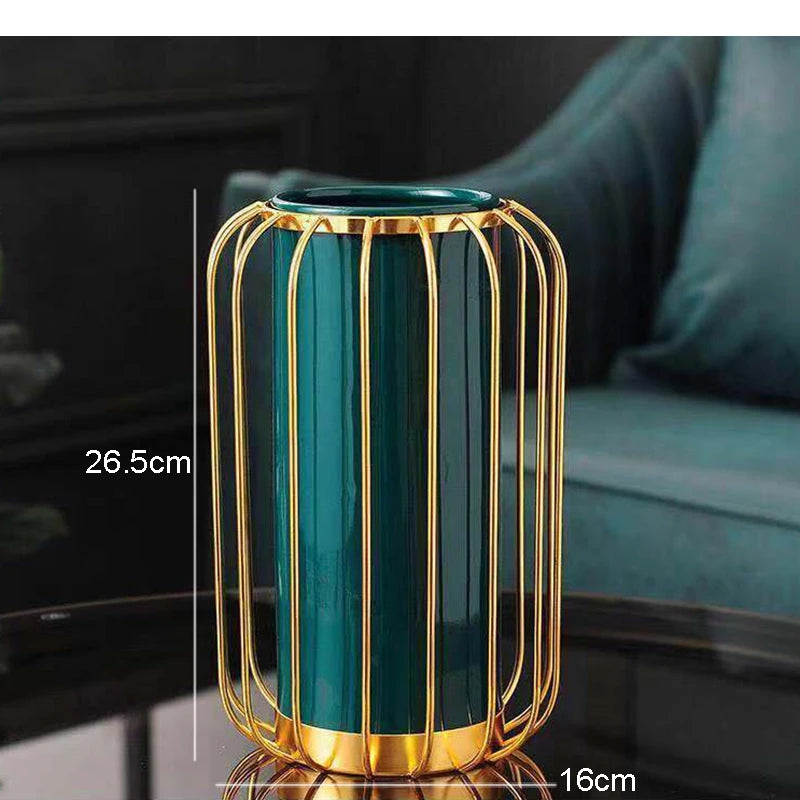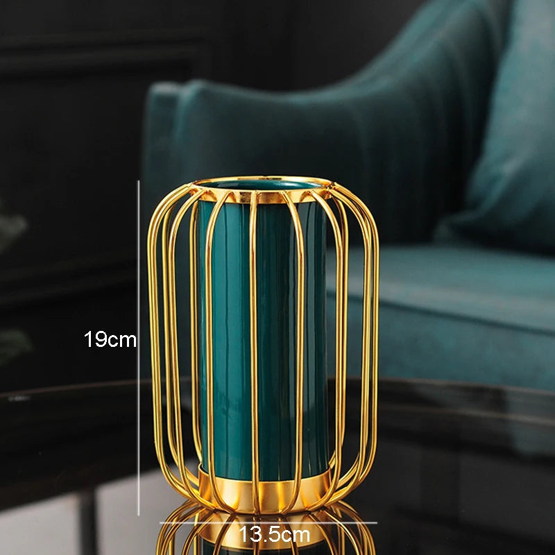 Diese moderne Keramikvase mit Metallrahmen verleiht jedem Raum Eleganz.