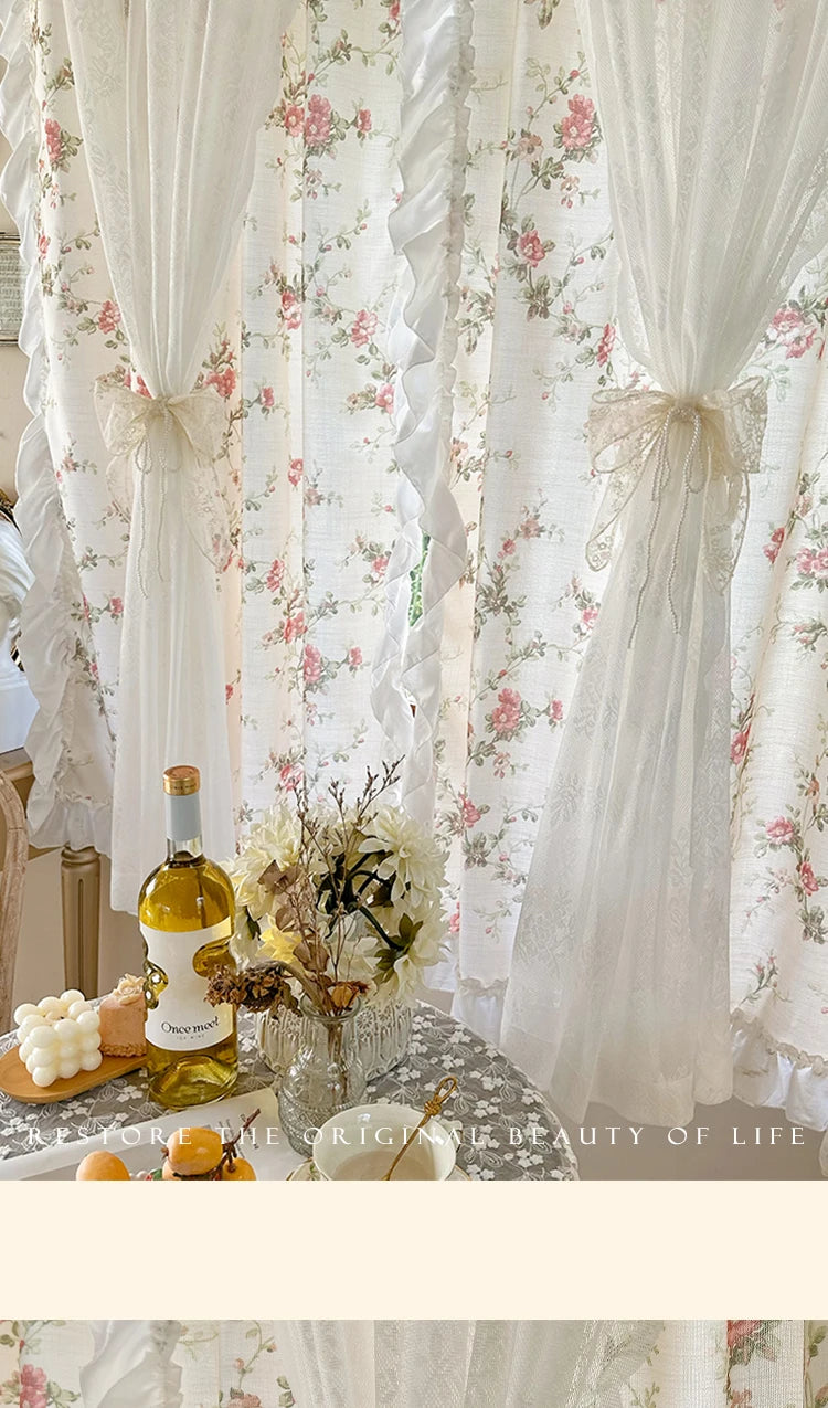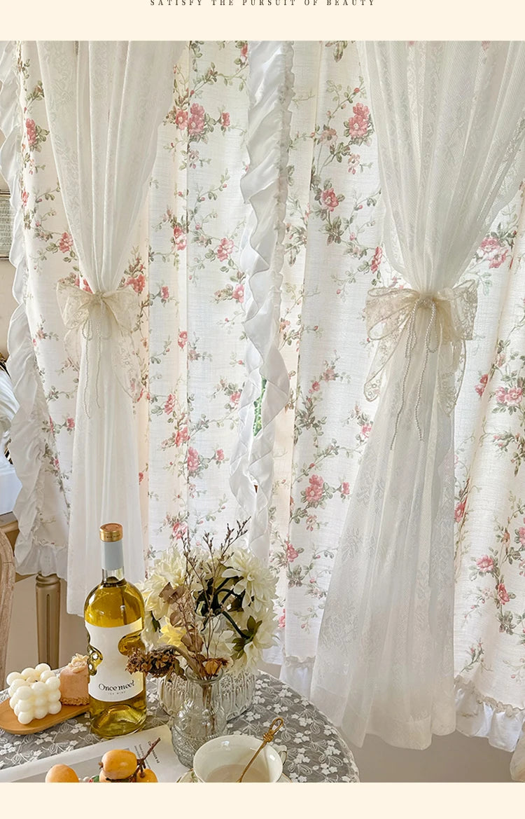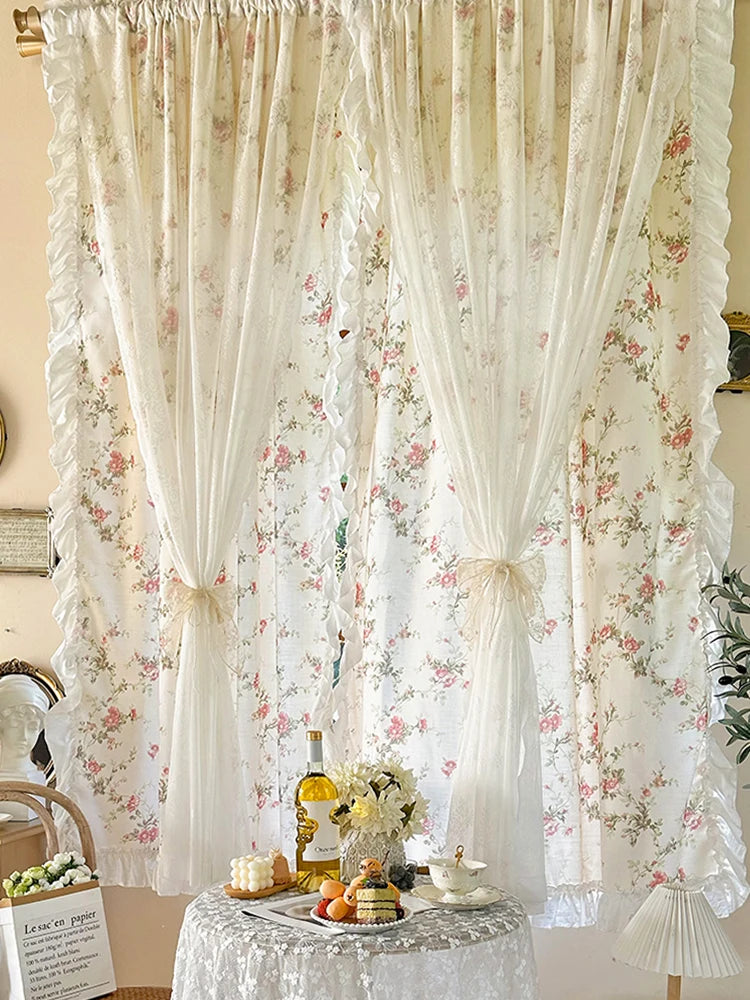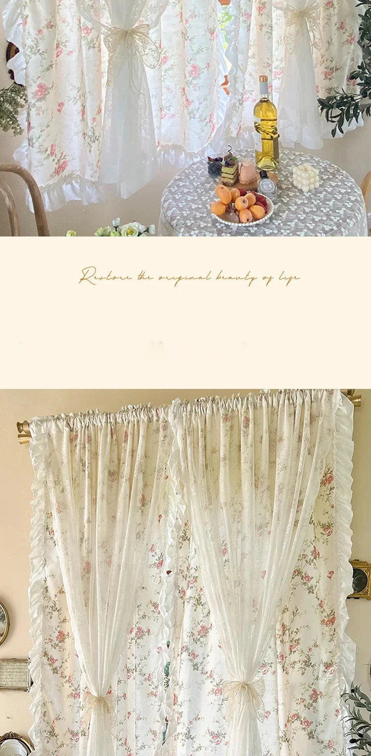 Verzaubern Sie Ihre Küche oder das Mädchenzimmer mit unseren eleganten Baumwoll-Leinenvorhängen, versehen mit einem charmanten Blumendesign und Rokoko-Spitzendetails. Diese zweilagigen Vorhänge bieten die perfekte Kombination aus Stil und Funktion und verleihen jedem Innenraum einen verspielten Touch.