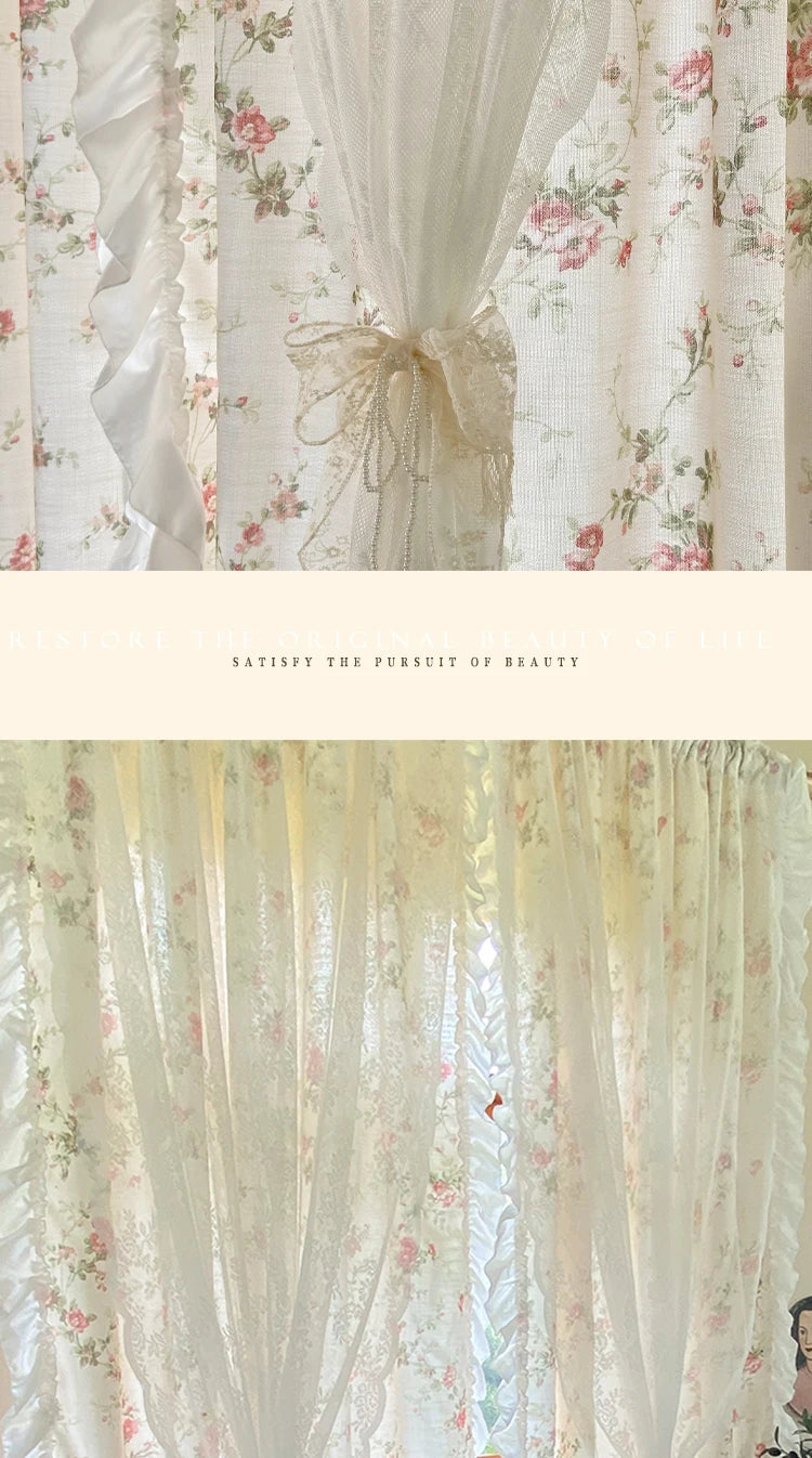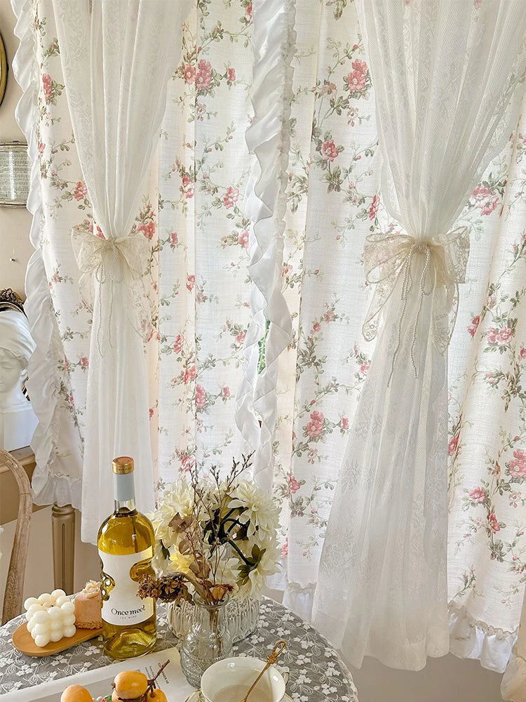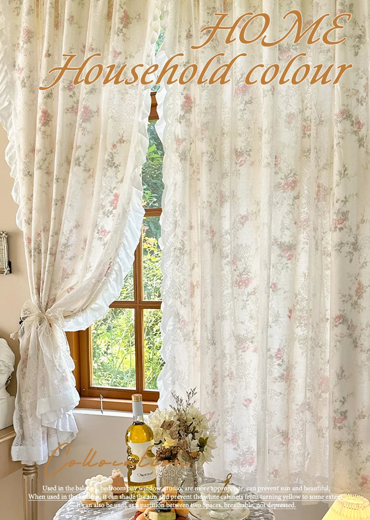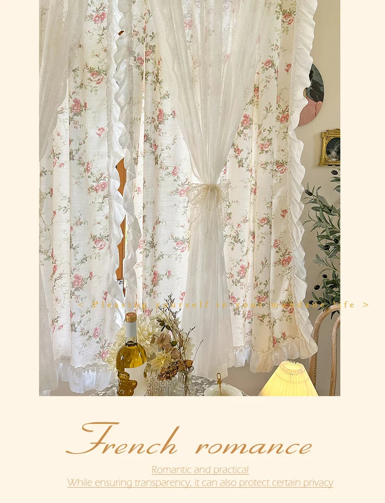 Diese eleganten Baumwoll-Leinenvorhänge, verziert mit einem Blumenmuster und Rokoko-Spitze, verleihen Ihrem Raum einen Hauch von Raffinesse und Stil. Ideal für Küchen, Mädchenzimmer und mehr, bieten sie das perfekte Gleichgewicht zwischen Schönheit und Funktionalität.