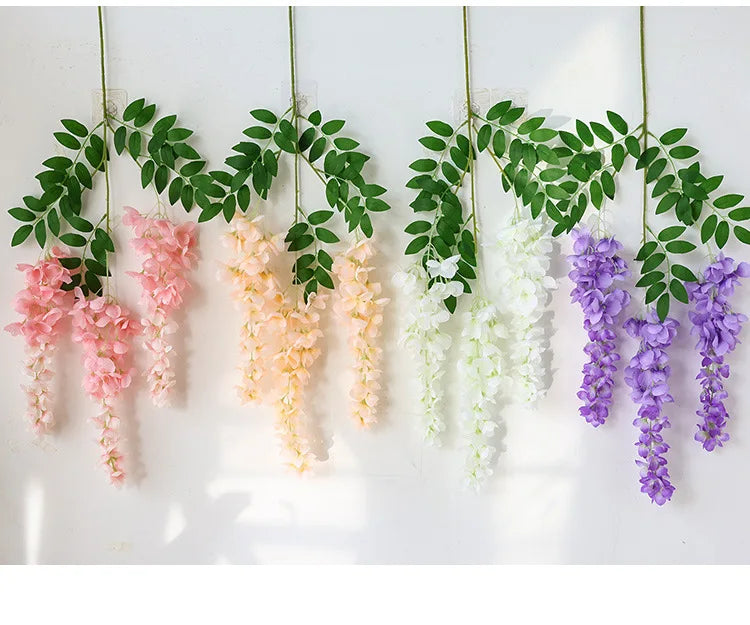 Unsere künstliche Wisteria besteht aus hochwertiger Seide, was ihre Haltbarkeit und ihr realistisches Aussehen gewährleistet. Mit einer Länge von 96cm bietet sie Vielseitigkeit in den Dekorationsmöglichkeiten – von hängenden Installationen bis hin zu dekorativen Mittelstücken bietet dieses Produkt Flexibilität und Stil für jeden Raum.