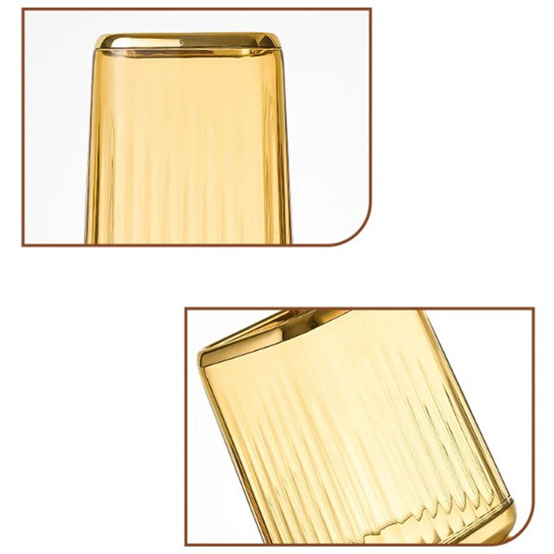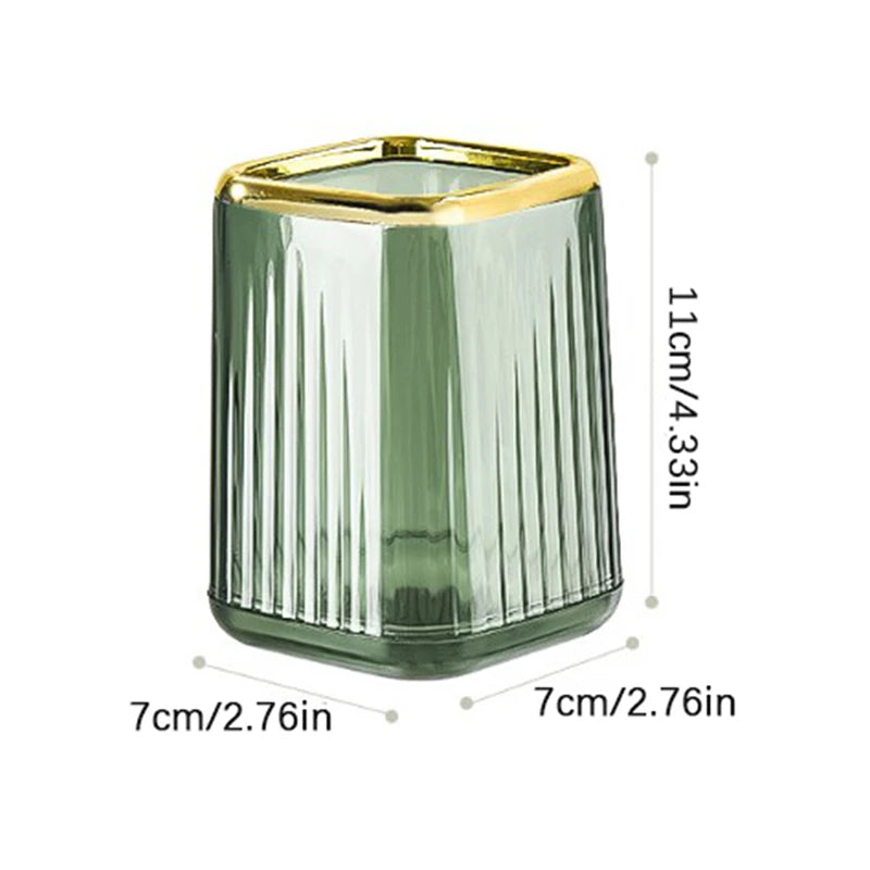 Der Makeup-Organizer zeichnet sich durch einen halbtransparenten Körper mit goldplattiertem Rand und erhöhte Bodenhöhe für Stabilität aus. Er misst 7x7x11cm und bietet ausreichend Platz für Aufbewahrung, ohne viel Raum einzunehmen.