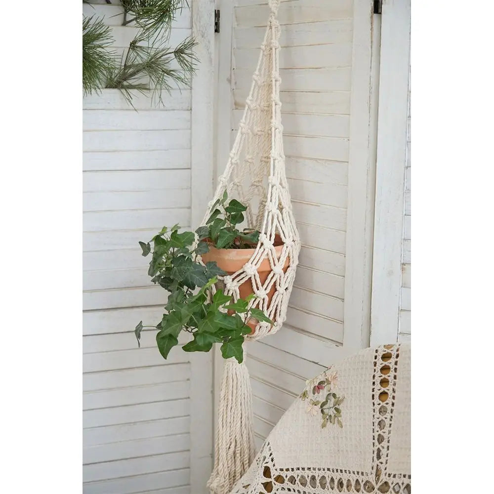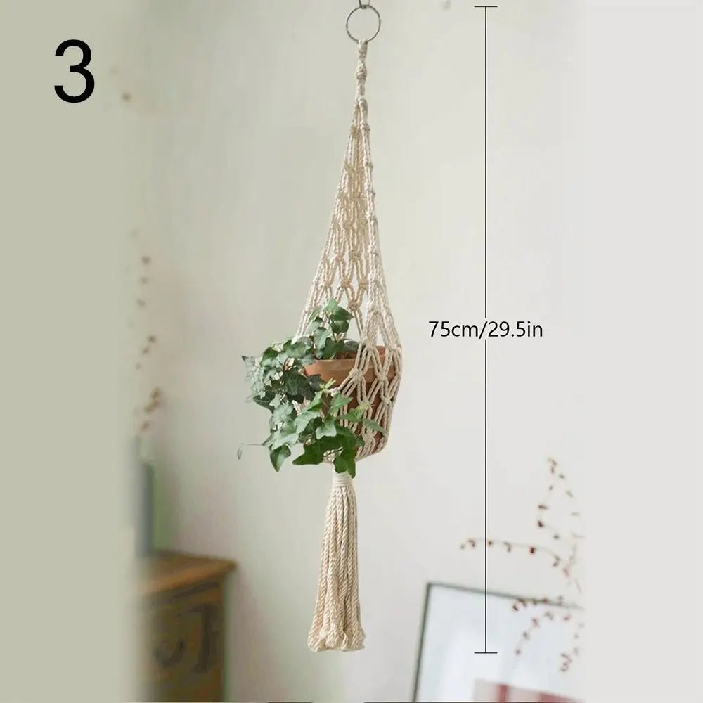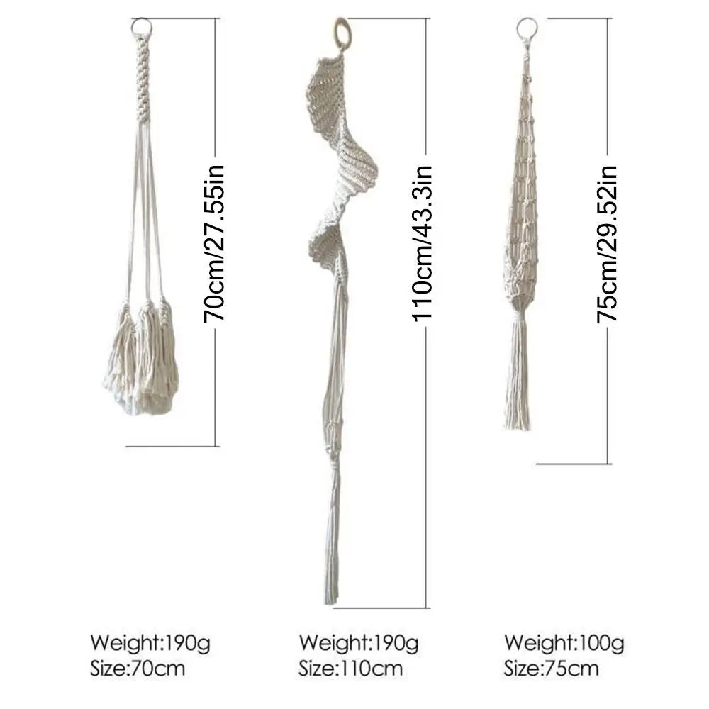 Verwandeln Sie Ihr Zuhause in eine grüne Oase mit unseren handgefertigten Makramee-Pflanzenhängern. Gefertigt aus hochwertigem beigem Baumwollseil, bieten sie einen zeitlosen Boho-Stil, der jeden Raum ergänzt.