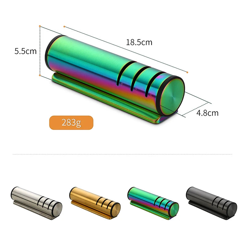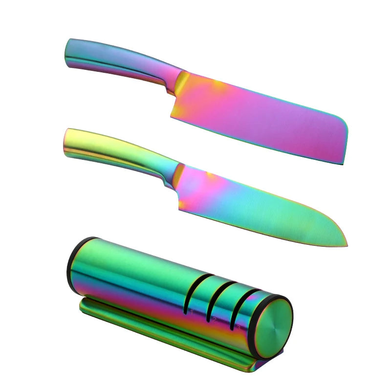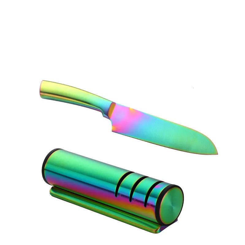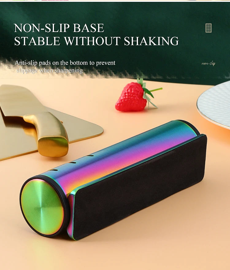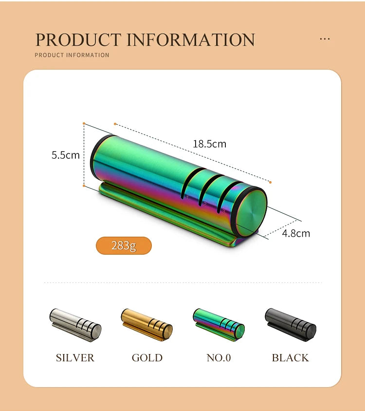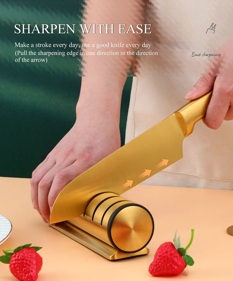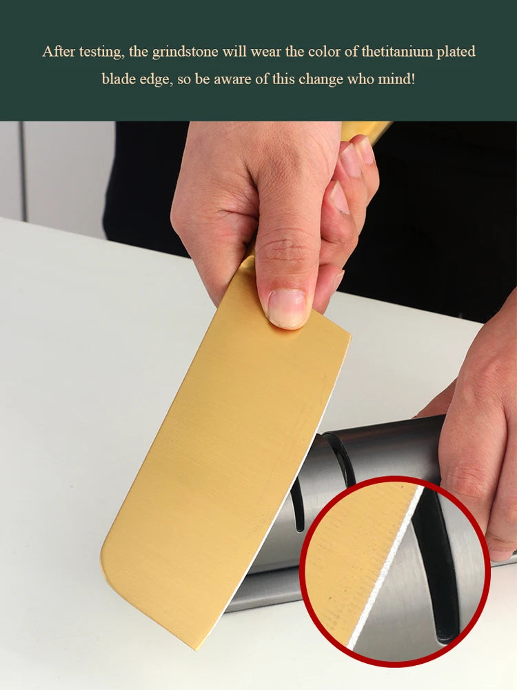 Hinweis: Nach dem Testen wird der Schleifstein die Farbe der titanbeschichteten Klingenkante abnutzen, aber dies wird die tägliche Nutzung nicht beeinträchtigen, bitte in der Art vorherrschen. Bitte stellen Sie sicher, dass Sie nichts dagegen haben, bevor Sie kaufen.