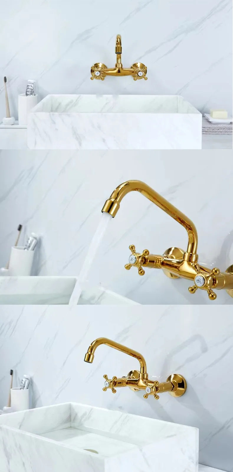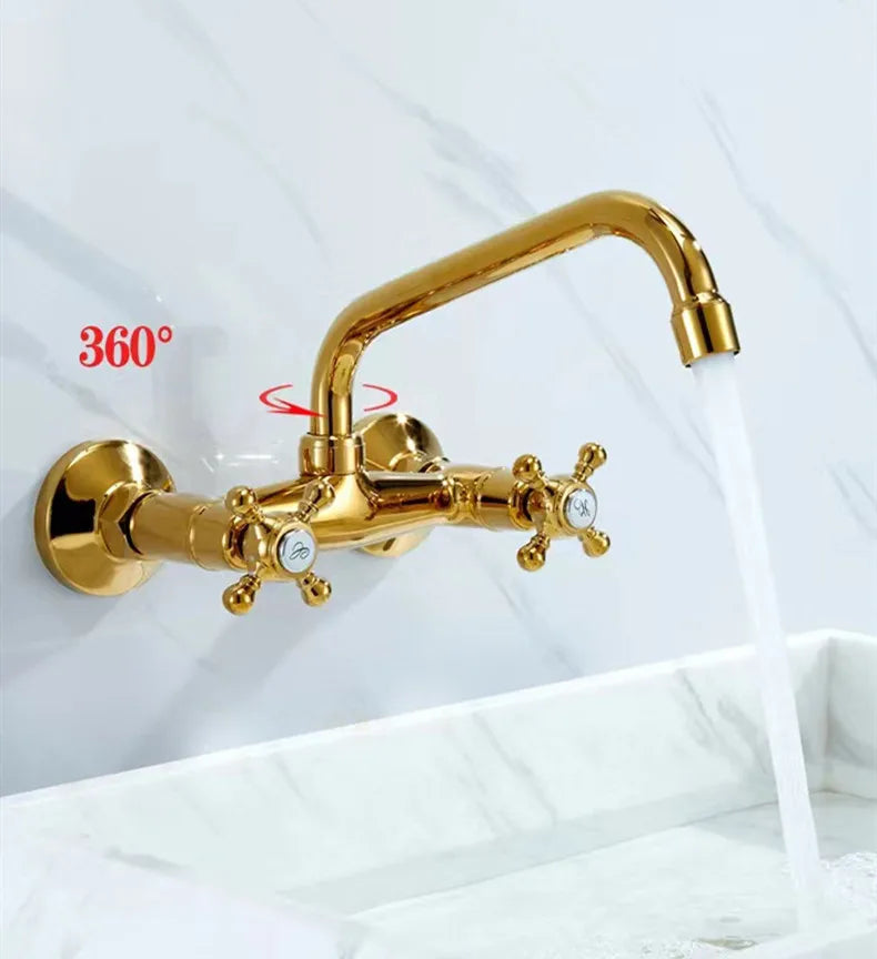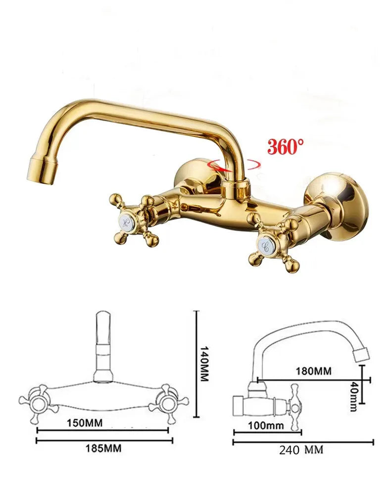 Perfekt für moderne Badezimmer, kombiniert diese Armatur Stil und Praktikabilität. Das Design mit zwei Griffen ermöglicht eine einfache Kontrolle der Wassertemperatur, während die Wandmontage einen eleganten Look bietet. Hergestellt aus langlebigem Messing, verfügt sie über ein atemberaubendes Goldfinish, das jedem Badezimmer einen Hauch von Luxus verleiht.