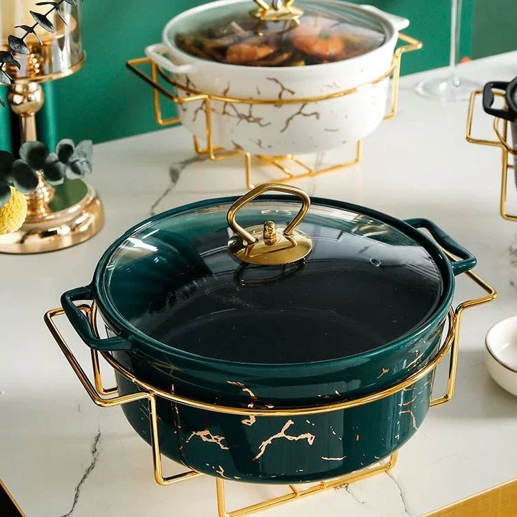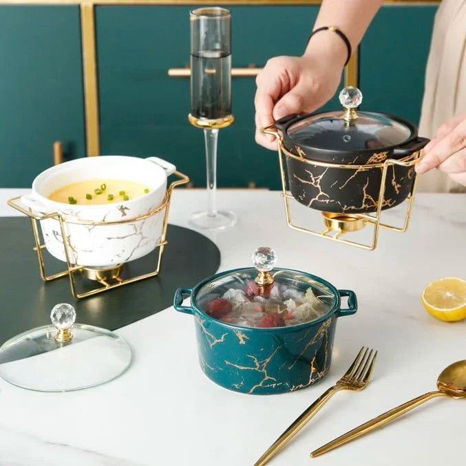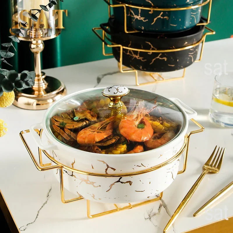 Diese luxuriöse Kasserollenhalterung mit einem Durchmesser von 24cm eignet sich perfekt für jede Familie, jedes Hotel oder Restaurant. Ihr Marmordesign in Goldoptik verleiht einen nordischen Touch und macht sie nicht nur funktional, sondern auch dekorativ.