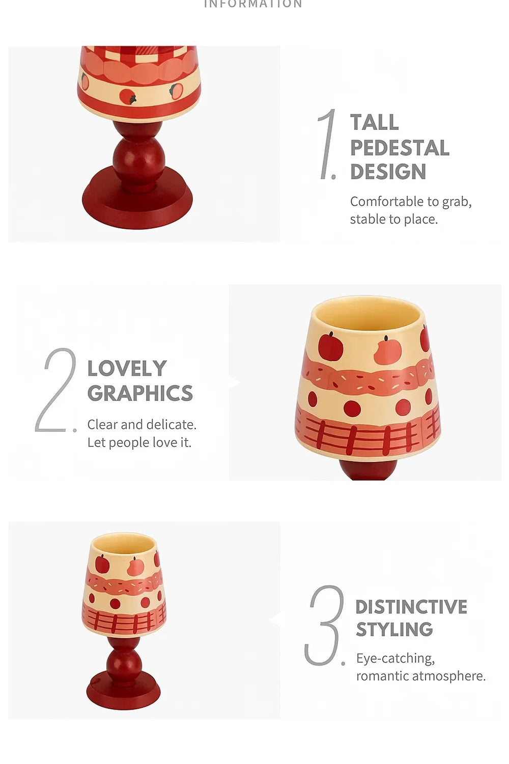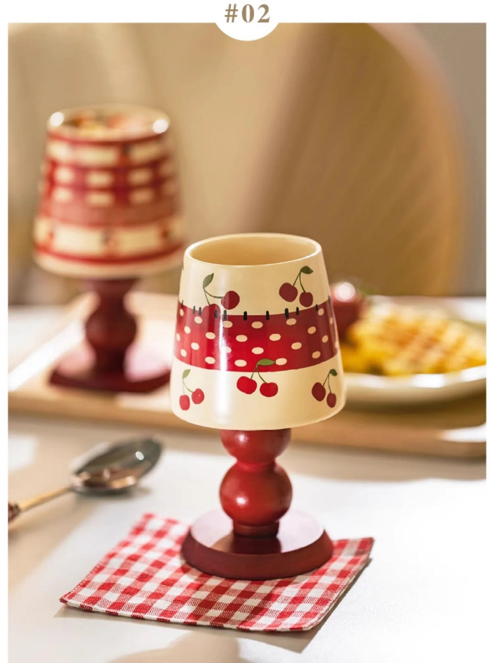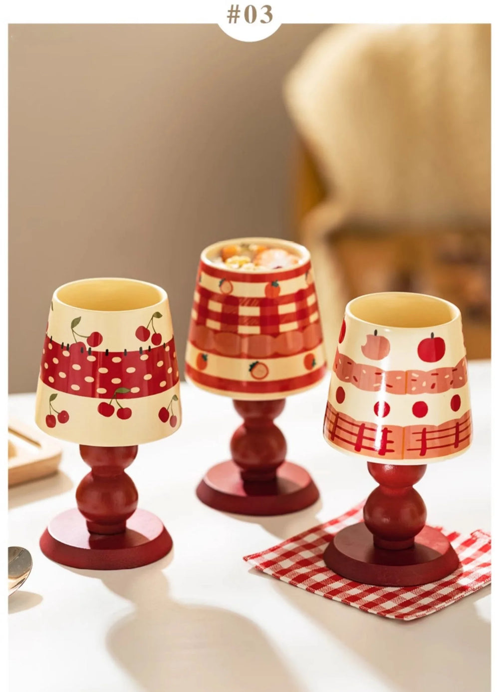 Die Tasse ist in Erdbeer-, Apfel- und Kirschdesigns erhältlich.
