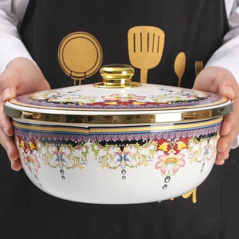 Die innere Emaille-Schicht scheint atmungsaktiv zu sein, was das Kochen texturierter macht. Der schwere Topfdeckel ist mit leichtem Druck gestaltet, was ein Überlaufen erschwert. Der zirkulierende, duschenartige Topfdeckel kann auch Wasserdampf in Wassertropfen kondensieren, die gleichmässig auf die Zutaten fallen und den ursprünglichen Geschmack und die Nährstoffe einschliessen. Die Emaille-Glasur ist ungiftig und frei von Schwermetallen und gibt beim Erhitzen keine schädlichen Substanzen ab, was gesünder ist als Materialien wie Plastik. Das retro bedruckte Design ist atmosphärisch und schön, was der Wohnkultur Farbe verleihen kann. Die Emaille-Oberfläche ist glatt und nicht porös, leicht zu reinigen und nicht leicht Flecken zu absorbieren. Selbst wenn der Topf versehentlich mit Lebensmitteln beklebt oder gefärbt wird, kann er durch Zugabe von sauberem Wasser und etwas Backpulver und Erhitzen für eine Weile wieder strahlend weiss wie neu gemacht werden. Darüber hinaus ist der Boden glatt, stabil platziert und für verschiedene Heizmethoden geeignet.