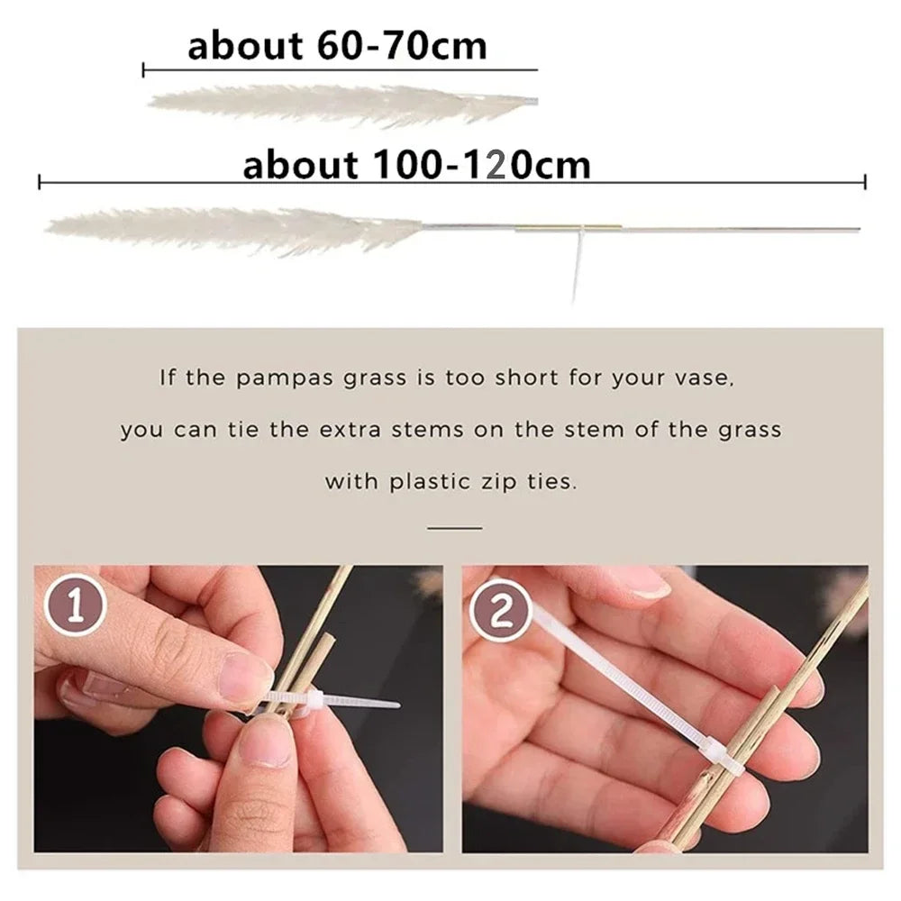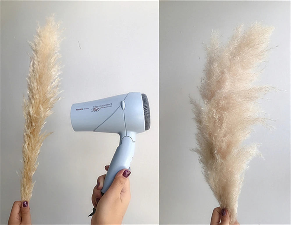 2. Bitte blasen Sie das Pampas mit einem Föhn etwa 3 Minuten lang, und das Pampasgras wird flauschiger. Bitte stellen Sie es in die Vase, aber fügen Sie kein Wasser hinzu.