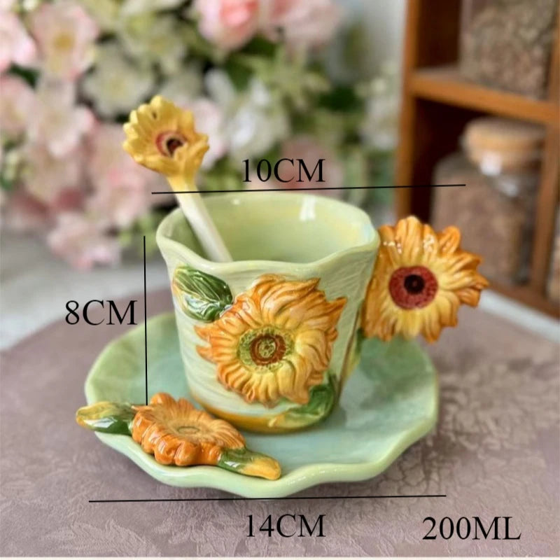 Geniessen Sie Ihren Lieblingskaffee aus unserer exquisiten Porzellantasse mit Sonnenblumenmotiv. Dank des einzigartigen handgezeichneten Designs und des umweltfreundlichen Materials bietet jede Tasse nicht nur ein bezauberndes Trinkerlebnis, sondern auch einen Hauch von Eleganz in Ihrem Morgenritual.