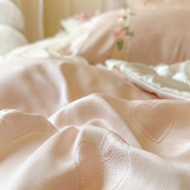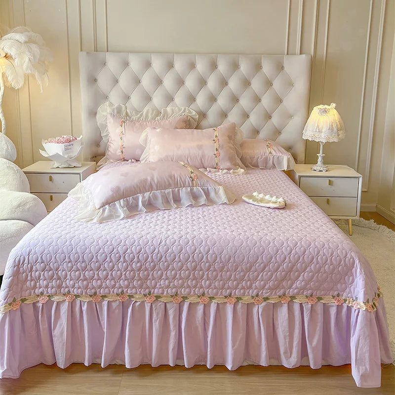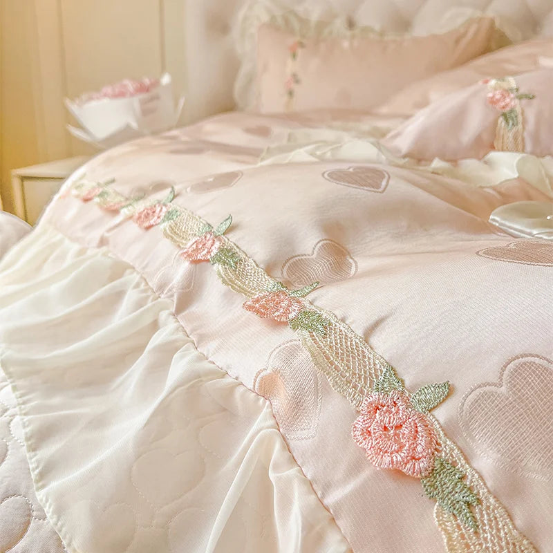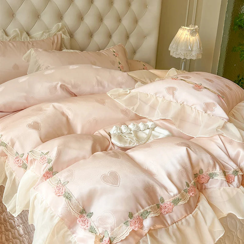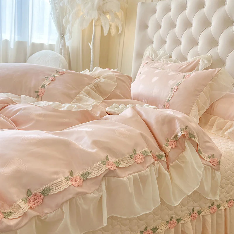 Verwandeln Sie Ihr Schlafzimmer in ein Märchenkönigreich mit diesem luxuriösen Bettwäsche-Set aus 100% reiner Baumwolle, verziert mit exquisiten Spitzenrüschen.