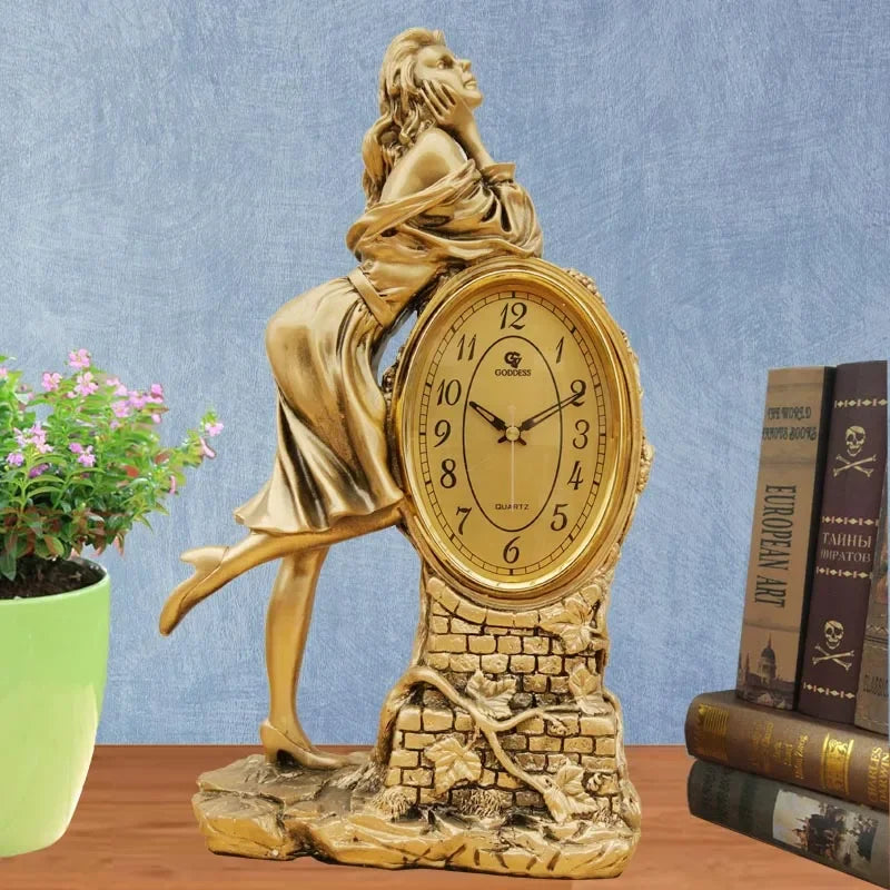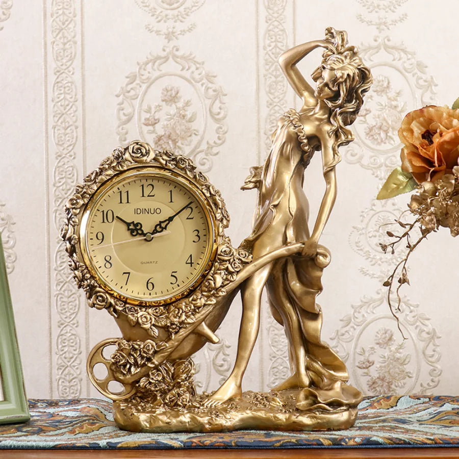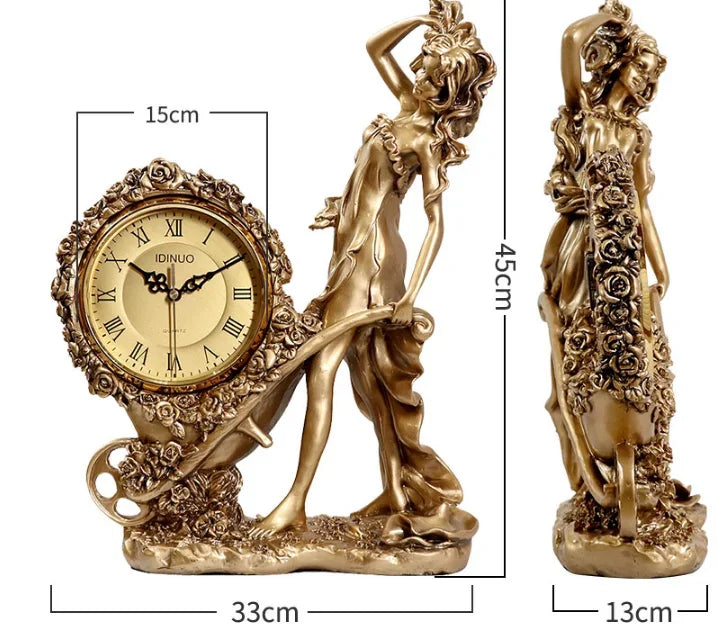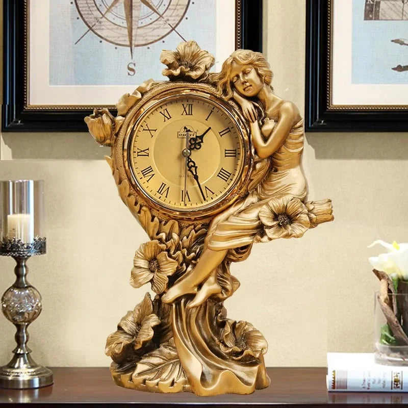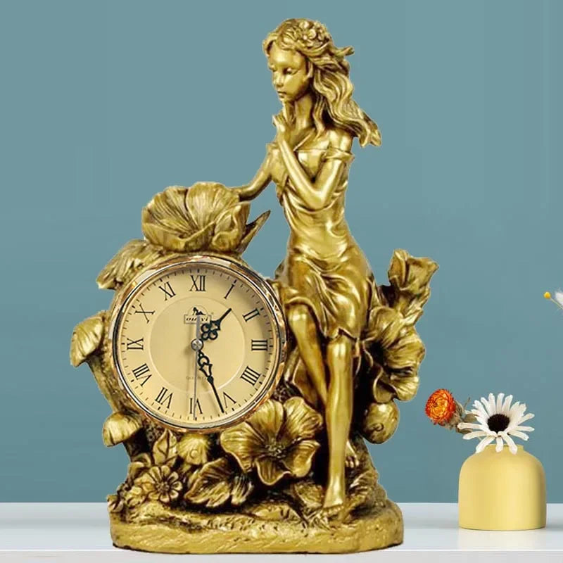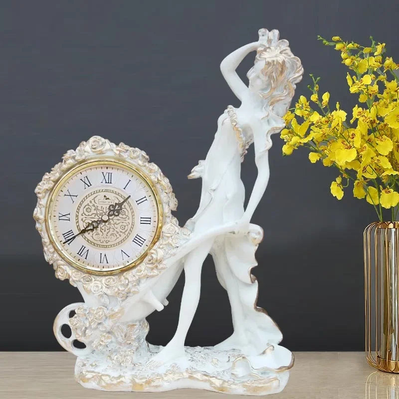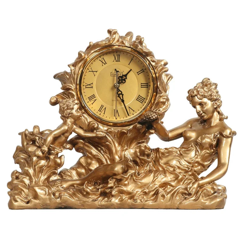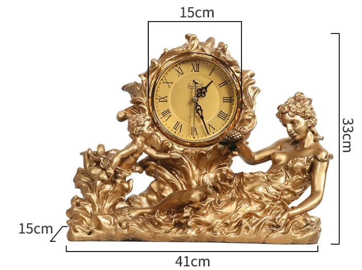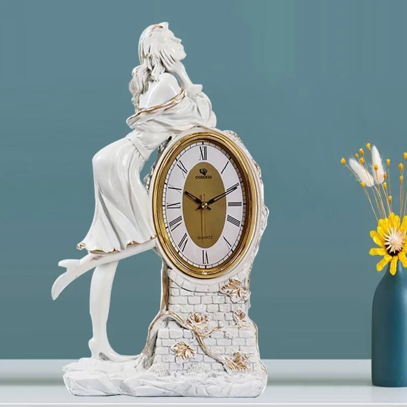 Diese Uhr verleiht jedem Raum mühelos einen Hauch von Raffinesse. Das Design der Göttinnenfigur erzählt eine Geschichte von Eleganz und Anmut, perfekt für diejenigen, die sich nach dem Charme europäischer Kunst sehnen. Positionieren Sie sie auf Ihrem Kaminsims oder Regal für einen dekorativen Akzent.
