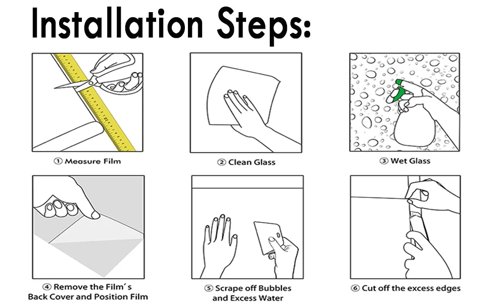 1. Messen & schneiden Sie die Folie, lassen Sie einen zusätzlichen Rand für Anpassungen. 2. Reinigen Sie die Ziel-Fensteroberfläche. 3. Die transparente Rückfolie abziehen. 4. Wasser auf die glatte Seite der Folie & das Fenster sprühen. 5. Wischen Sie die Folie ab, stellen Sie sicher, dass Blasen entfernt wurden. 6. Schneiden Sie die Ränder ab.