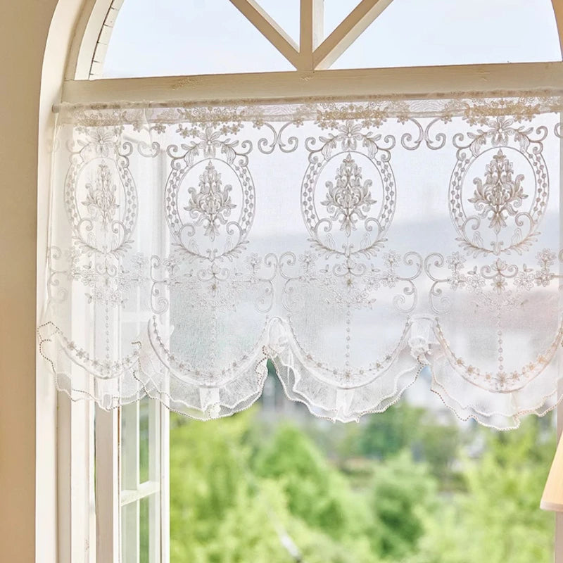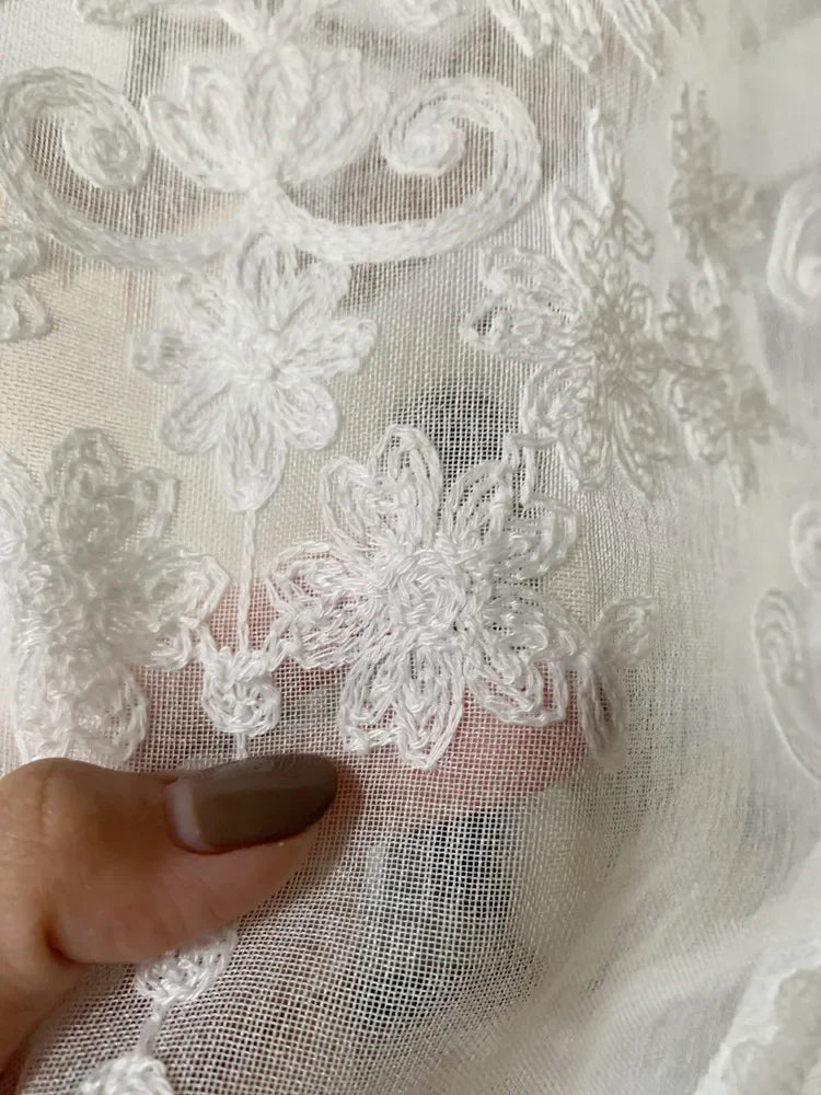 Hüllen Sie Ihr Zuhause in pure Romantik mit unseren bestickten weissen Tüllvorhängen – ideal zum Hinzufügen eines Hauch von Anmut in jede Küche oder jedes Schlafzimmer.