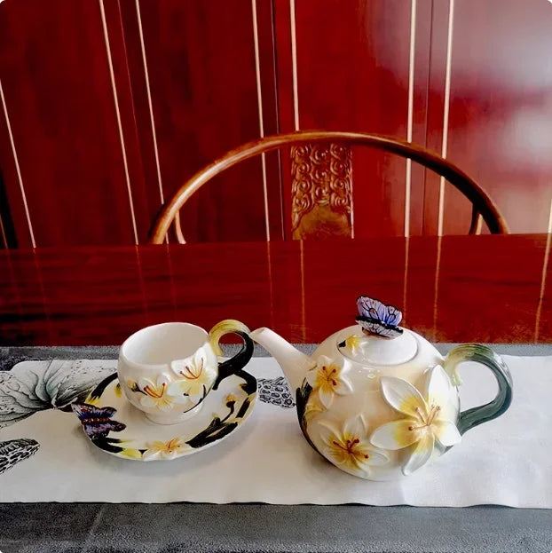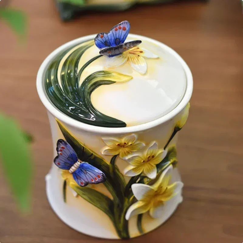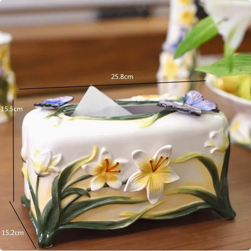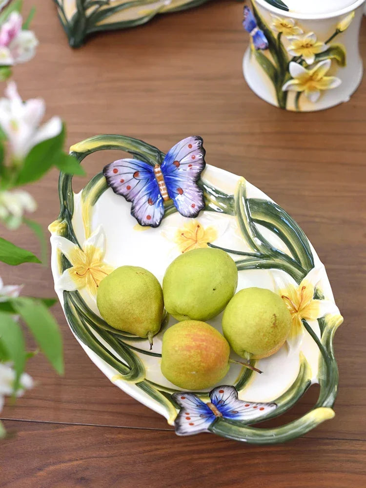 Aus hochwertiger Keramik gefertigt, besticht dieses Tablett durch seine glatte Oberfläche und das filigrane Schmetterlingsorchideen-Design. Seine umweltfreundliche Zusammensetzung sorgt für Sicherheit und Schönheit in Harmonie.